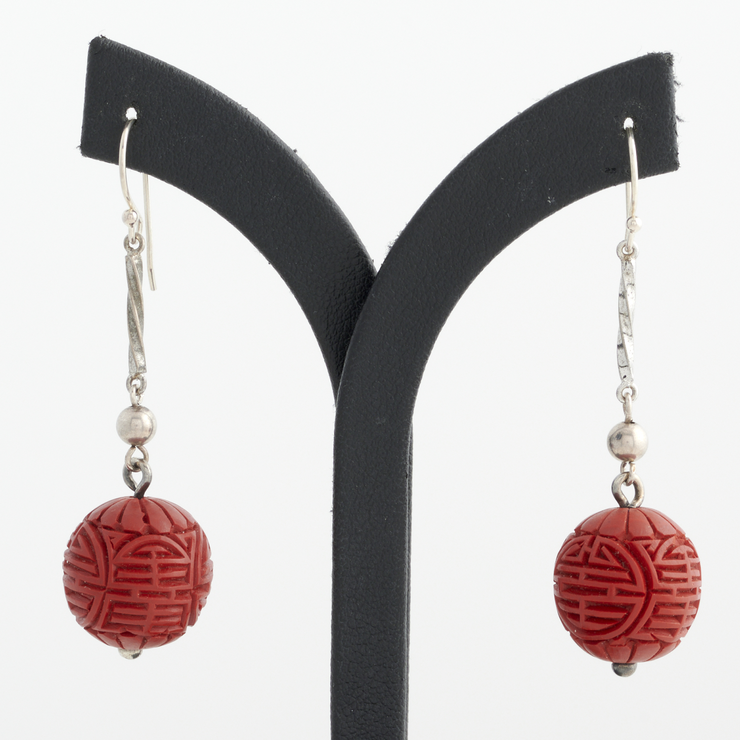 A PAIR OF CINNABAR LACQUER EARRINGS TO SHEPHERD HOOK FITTINGS IN BASE METAL, DROP LENGTH 53MM