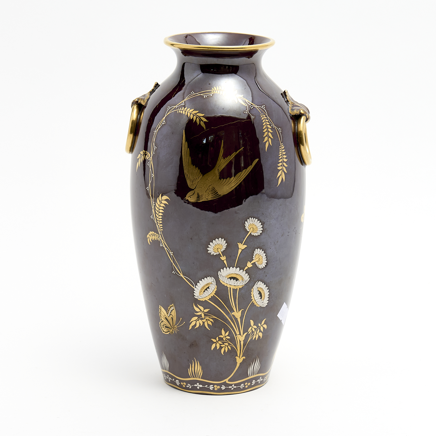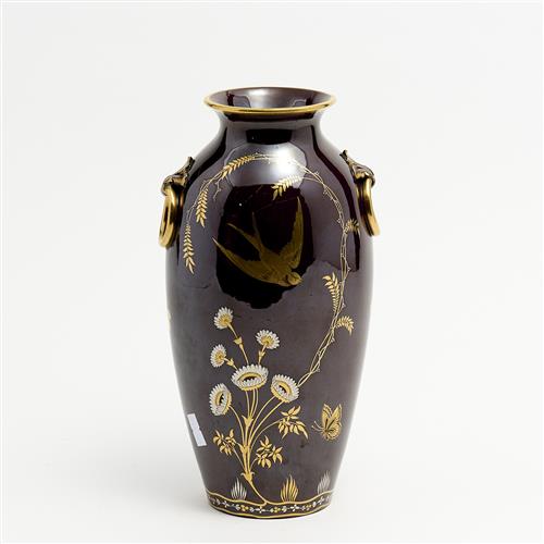 A MINTON BROWN-GLAZED VASE WITH SILVERED FLOWERS AND BIRDS IN FLIGHT H.27CM, LEONARD JOEL DELIVERY SIZE: MEDIUM