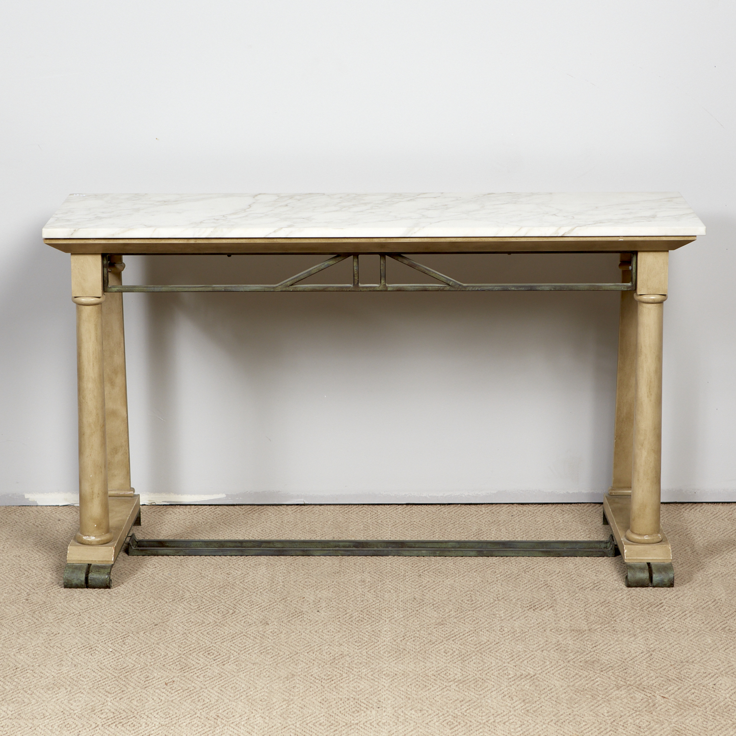 AN ANTIQUE STYLE PAINTED CONSOLE TABLE WITH MARBLE TOP (A/F) (86H X 150W X 49D CM) (THIS HEAVY ITEM MUST BE REMOVED BY CARRIERS AT THE CUSTOMER'S EXPENSE. LEONARD JOEL STAFF CANNOT ASSIST CARRYING THIS ITEM) (X-LARGE)