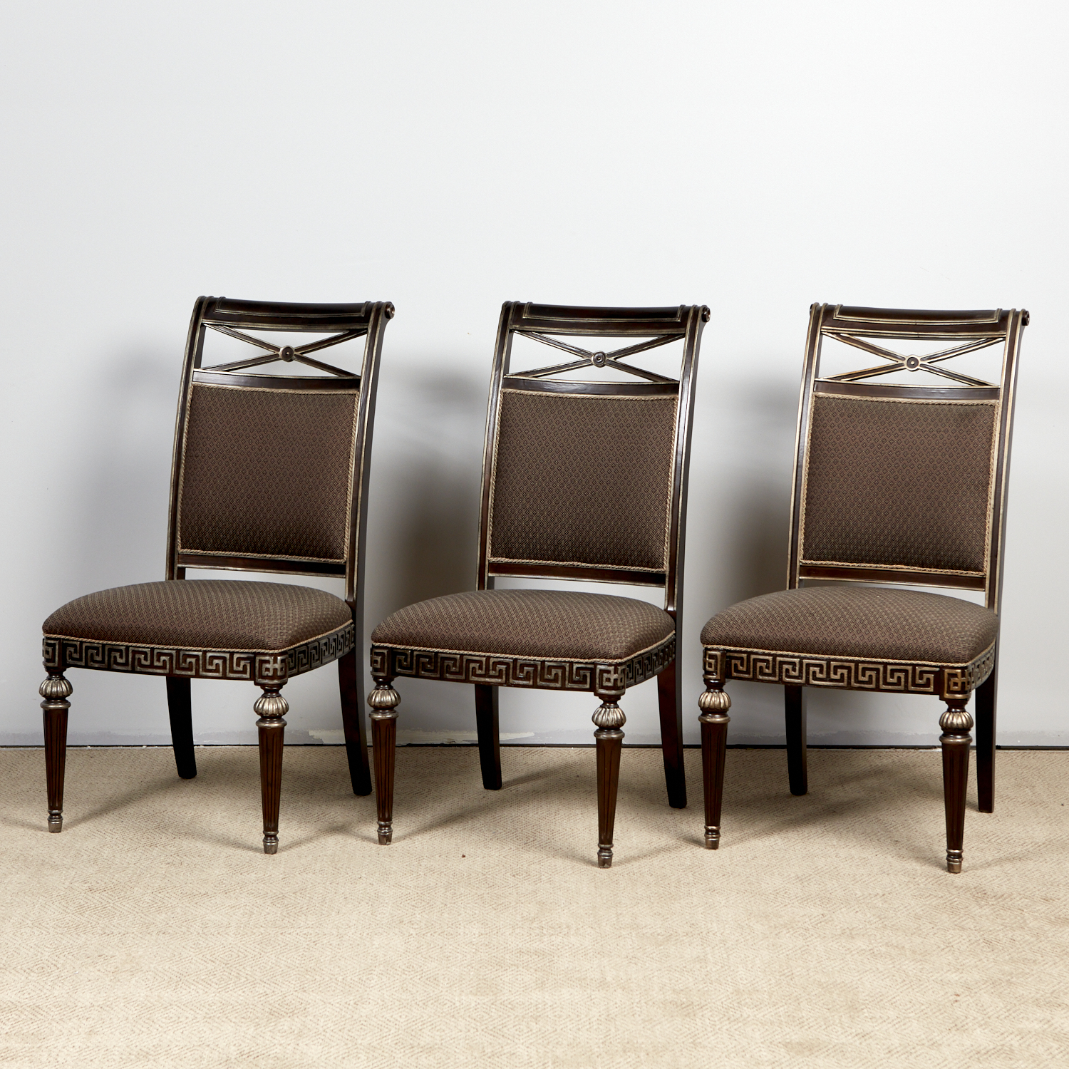 A SET OF THREE FRENCH EMPIRE STYLE EBONISED & UPHOLSTERED LOUNGE CHAIRS (107H X 55W X 63D CM) (LEONARD JOEL DELIVERY: X-LARGE)