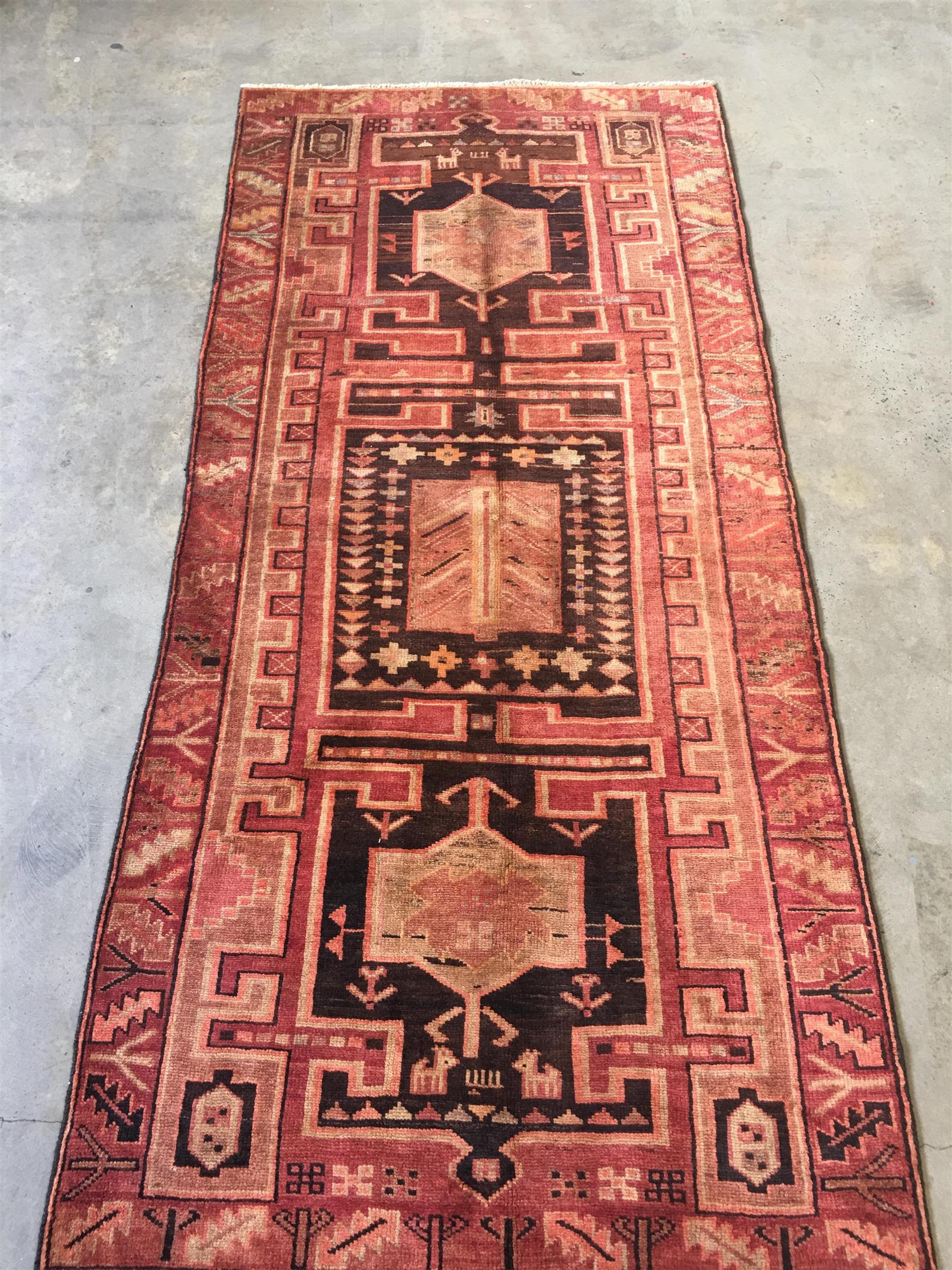 A PERSIAN NOMADIC LURISTAN CHESHME RUG, 100% WOOL AND NATURAL DYES, SOLID AND DENSE. HAND KNOTTED NOMADIC WEAVE WITH A DESIGN OF TRIPLE CENTRAL ANCHORED MEDALLIONS CONTAINING TRIBAL AND TREE OF LIFE MOTIFS. SOFT CORAL TONES ALL OVER. SIZE: 268 X 125 CM -ORIGIN: PERSIA – RRP: $1,300 CONDITION: GOOD, CLEAN CONDITION. DOCUMENTATION OF AUTHENTICITY INCLUDED.