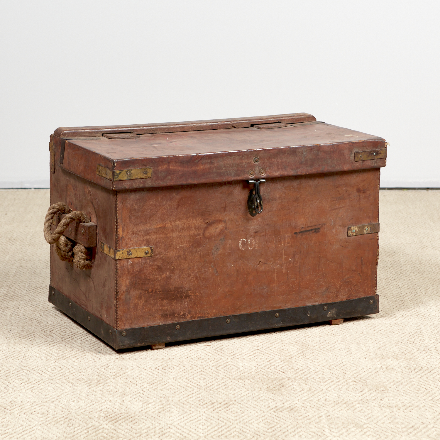 AN EARLY 20TH CENTURY LEATHER BOUND TRAVELLERS TRUNK WITH BRASS DETAILS (A/F) (46H X 77W X 46D CM) (LEONARD JOEL DELIVERY: LARGE)