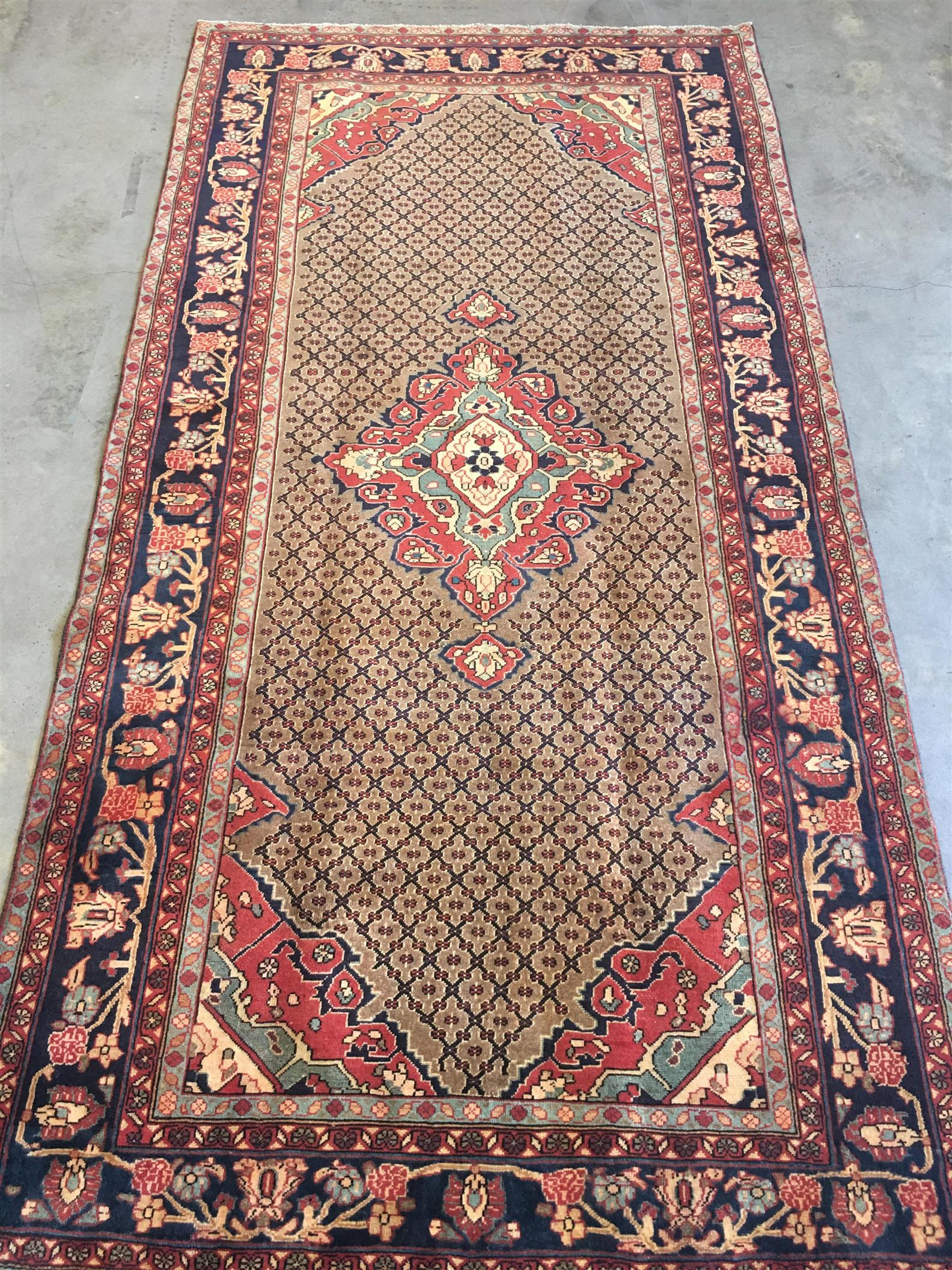 PERSIAN SONGOR KOLYAIE RUG 100% WOOL PILE. SOLID & DENSE. HAND-KNOTTED WEAVE FROM THE KURDISTAN REGION WITH DESIGN OF DIAMOND FLORAL MEDALLION IN PEACH AND BLUE TONES ON A LATTICE-PATTERNED FIELD. FLORAL CORNER MEDALLIONS IN FRENCH BLUE & RUST COLOUR TONES. TRIBAL-PATTERNED BORDER. SIZE: 304 X 157 CM- ORIGIN: PERSIA – RRP: $2,100 CONDITION: EXCELLENT DOCUMENTATION OF AUTHENTICITY INCLUDED.