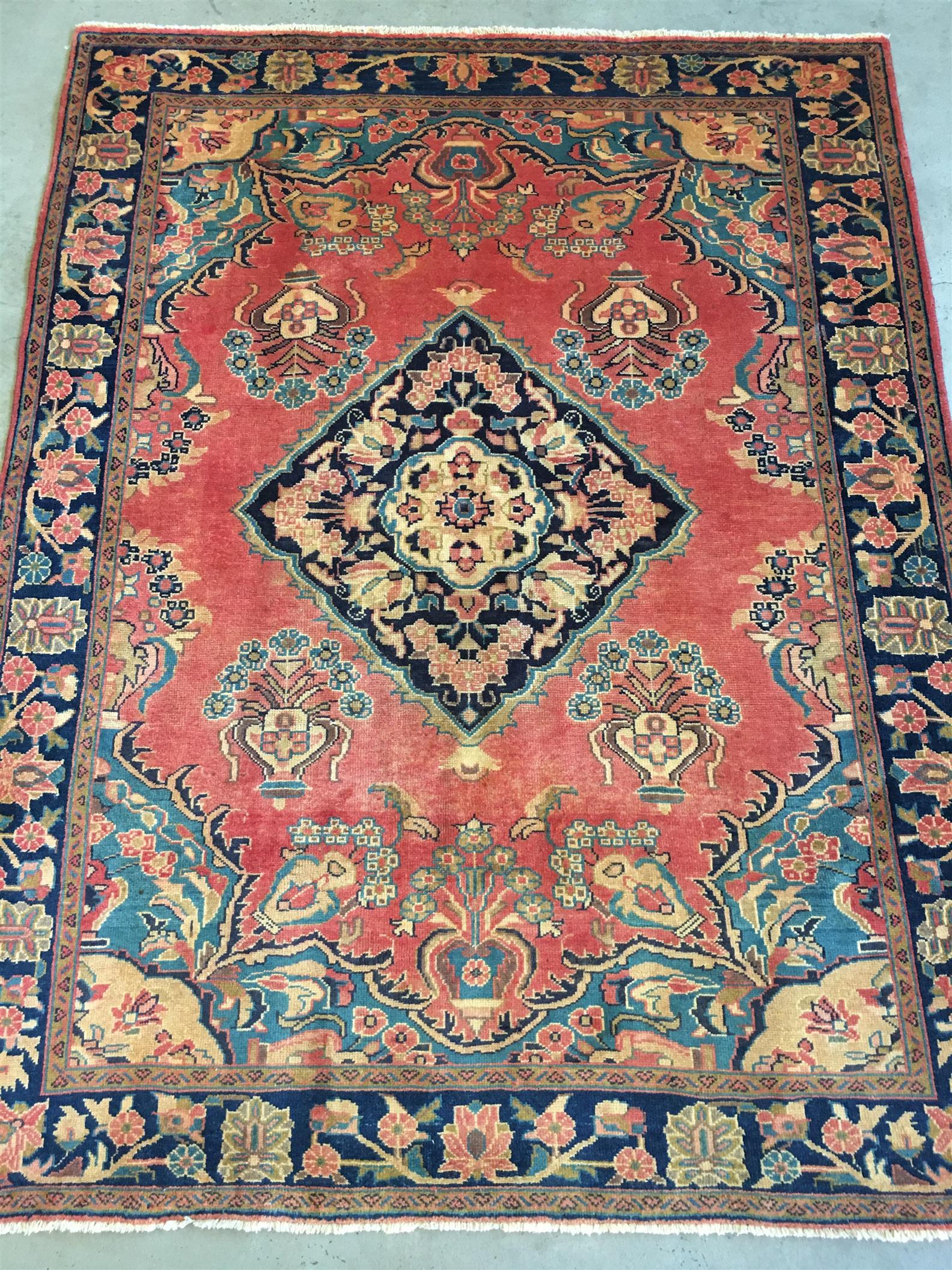 AN ALL-OVER VASE DESIGN PERSIAN LILIHAN RUG. 100% HAND SPUN WOOL, NATURAL DYES. HAND- KNOTTED WEAVE FROM THE KHOMEYN REGION WITH TRADITIONAL DESIGN OF CENTRAL DIAMOND FLORAL MEDALLION IN A NAVY TONE ON A SOFT RED FIELD WITH FRENCH BLUE QUARTERED CORNER MEDALLIONS IN A MELLOWED, RED-TONED FIELD OF FLORAL POLYNESIAN MOTIFS; TENDRILS. SIZE: 210 X 162 CM-ORIGIN: PERSIA – RRP: $1,500 CONDITION: SEMI VINTAGE PILE DOCUMENTATION OF AUTHENTICITY INCLUDED.