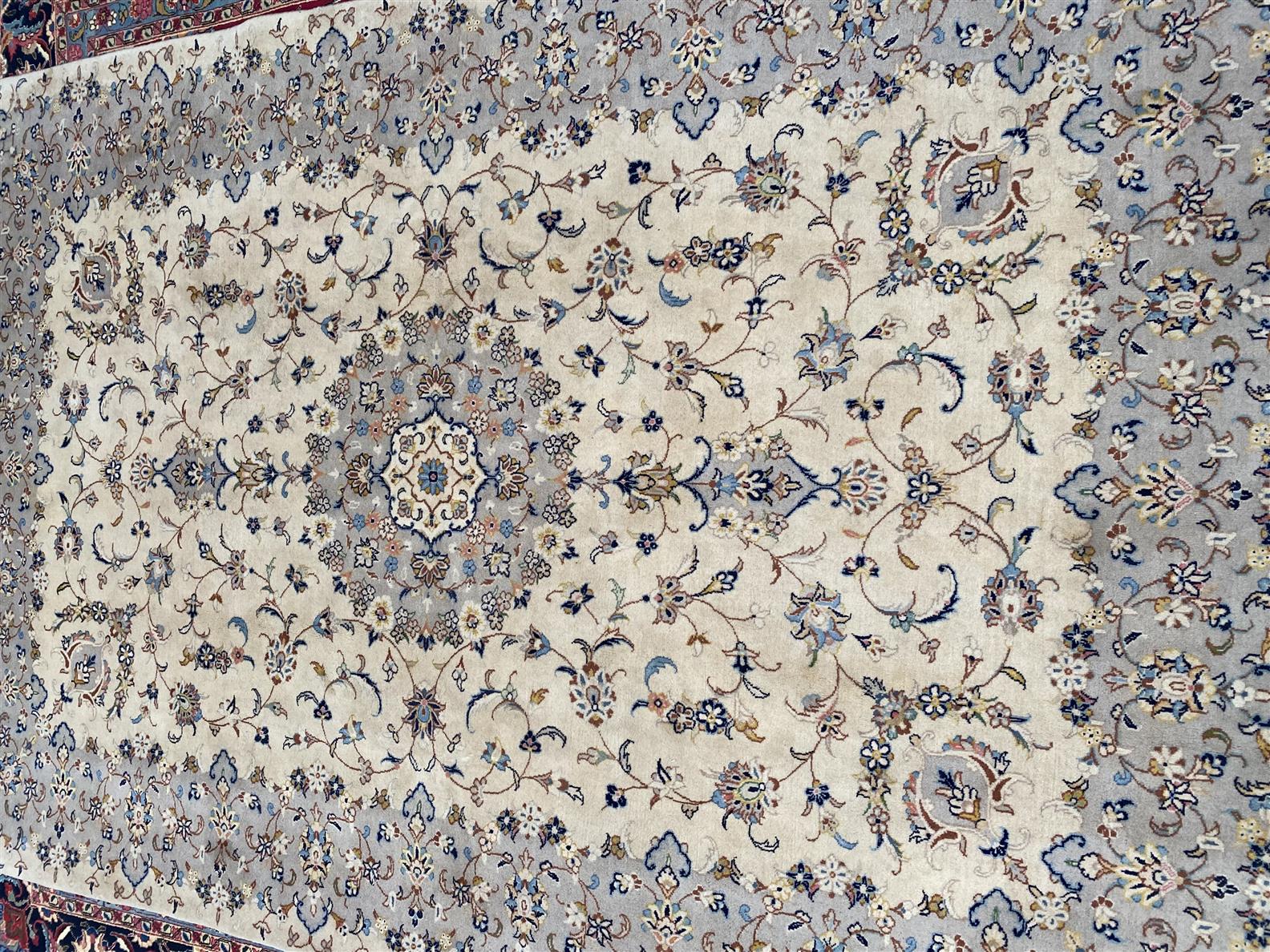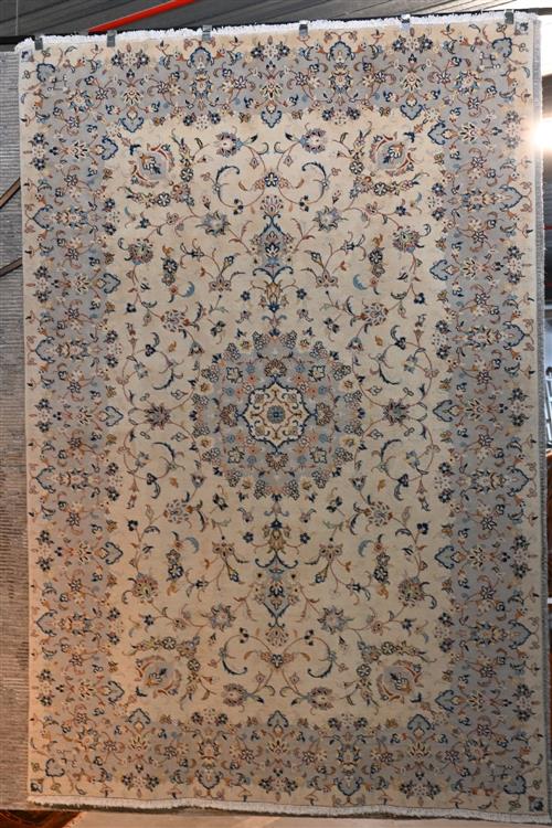 PERSIAN CREAM KASHAN CARPET. WITH 100% LAMBS WOOL PILE, VERY SOLID AND DENSELY HAND KNOTTE'D, SOLID WEAVE. A TRADITIONAL DESIGN OF A BEAUTIFUL ELEGANT CENTRAL MEDALLION IN SOFT TONES OF LIGHT BLUE, CREAM; GREY. ALL OVER SHA ABBASI PALMETTES AND ARABESQUE SCROLLS, IN TONES OF CHAMPAGNE AND FRENCH BLUE ; LIGHT ROSE. SIZE: 297 X 200 CM ORIGIN: PERSIA – RRP: $2,900 CONDITION IS EXCELLENT DOCUMENTATION OF AUTHENTICITY INCLUDED.