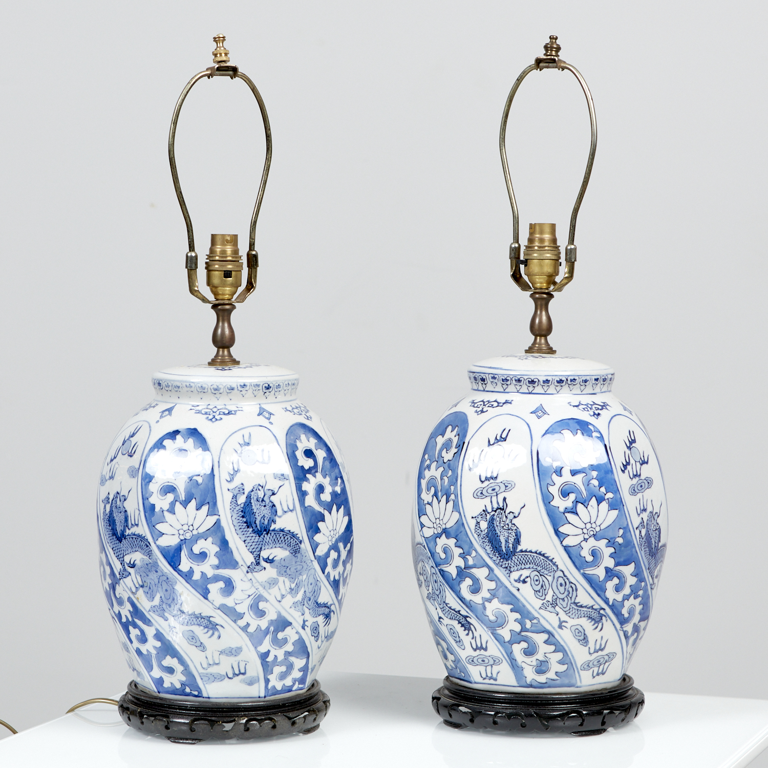 A PAIR OF CHINOISERIE STYLE BLUE & WHITE PAINTED GINGER JAR FORM LAMPS (63H X 24DIA CM) (LEONARD JOEL DELIVERY: LARGE)