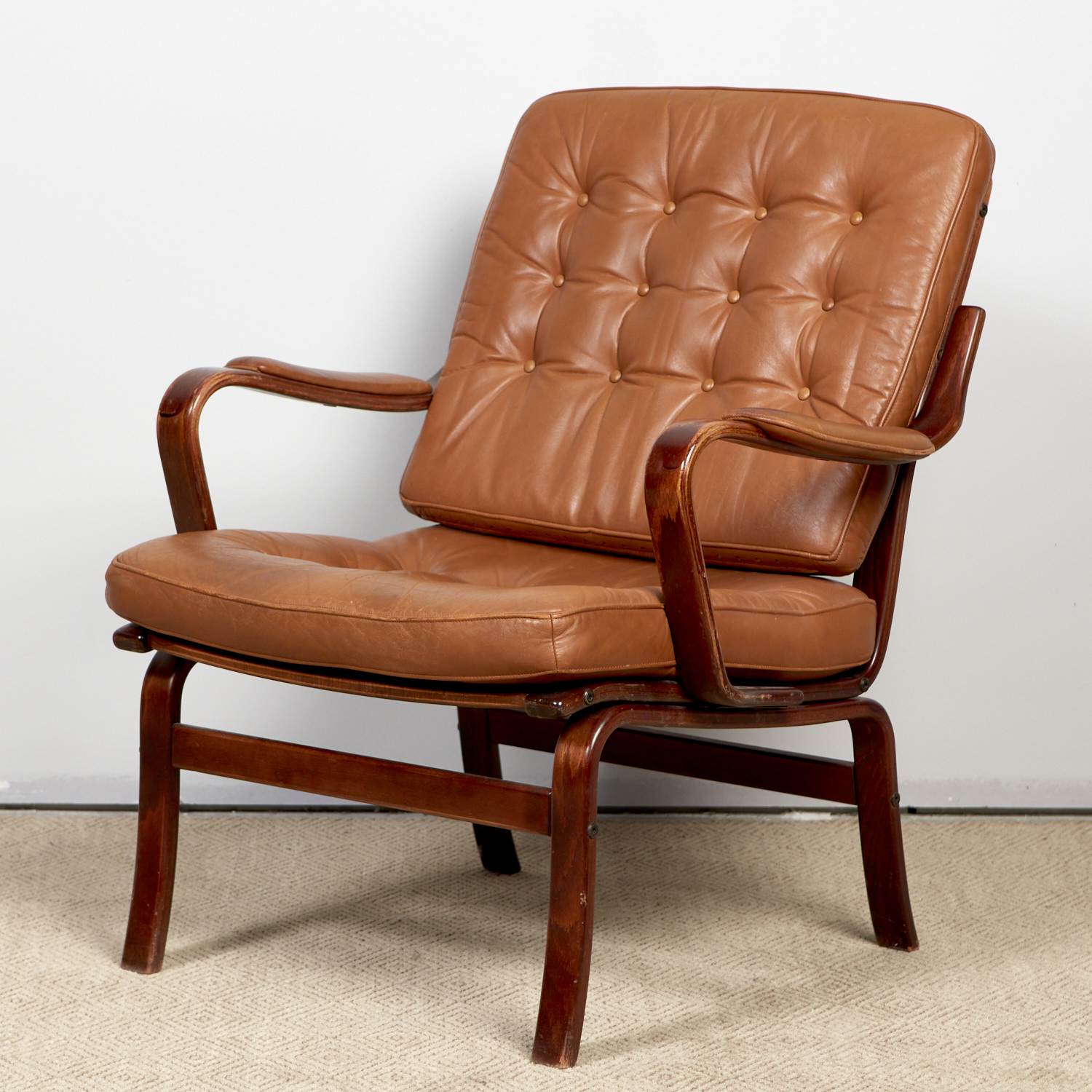 SWEDISH COGNAC LEATHER LOUNGE CHAIR BY GOTE MOBLER (90H X 76W X 74D CM) (LEONARD JOEL DELIVERY: LARGE)