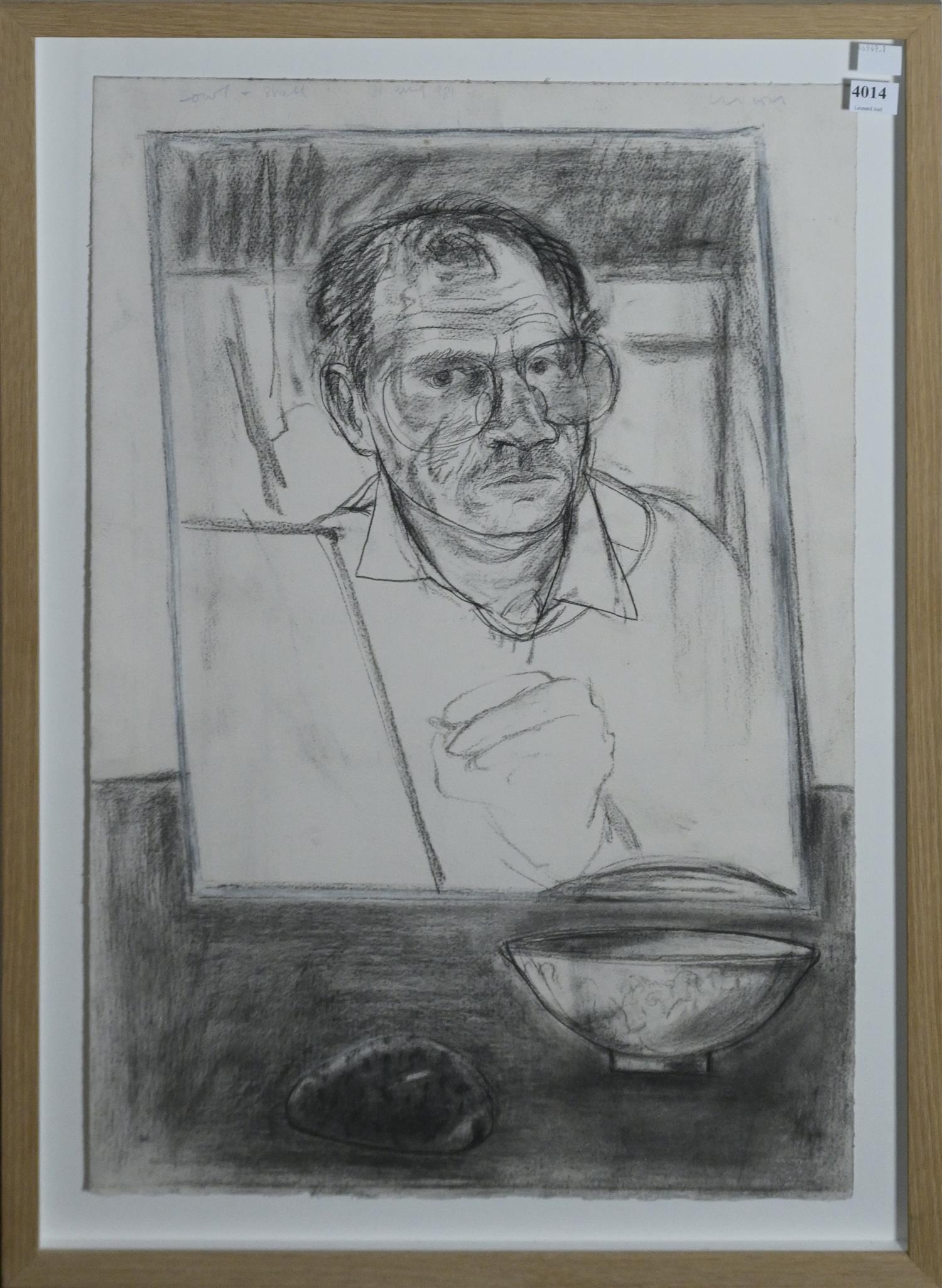 KEVIN LINCOLN, SELF PORTRAIT WITH BOWL AND SHELL 1981, CHARCOAL ON PAPER, SIGNED, TITLED AND DATED ABOVE IMAGE, 60 X 40CM (SHEET), FRAME SIZE: 70 X 49.5CM