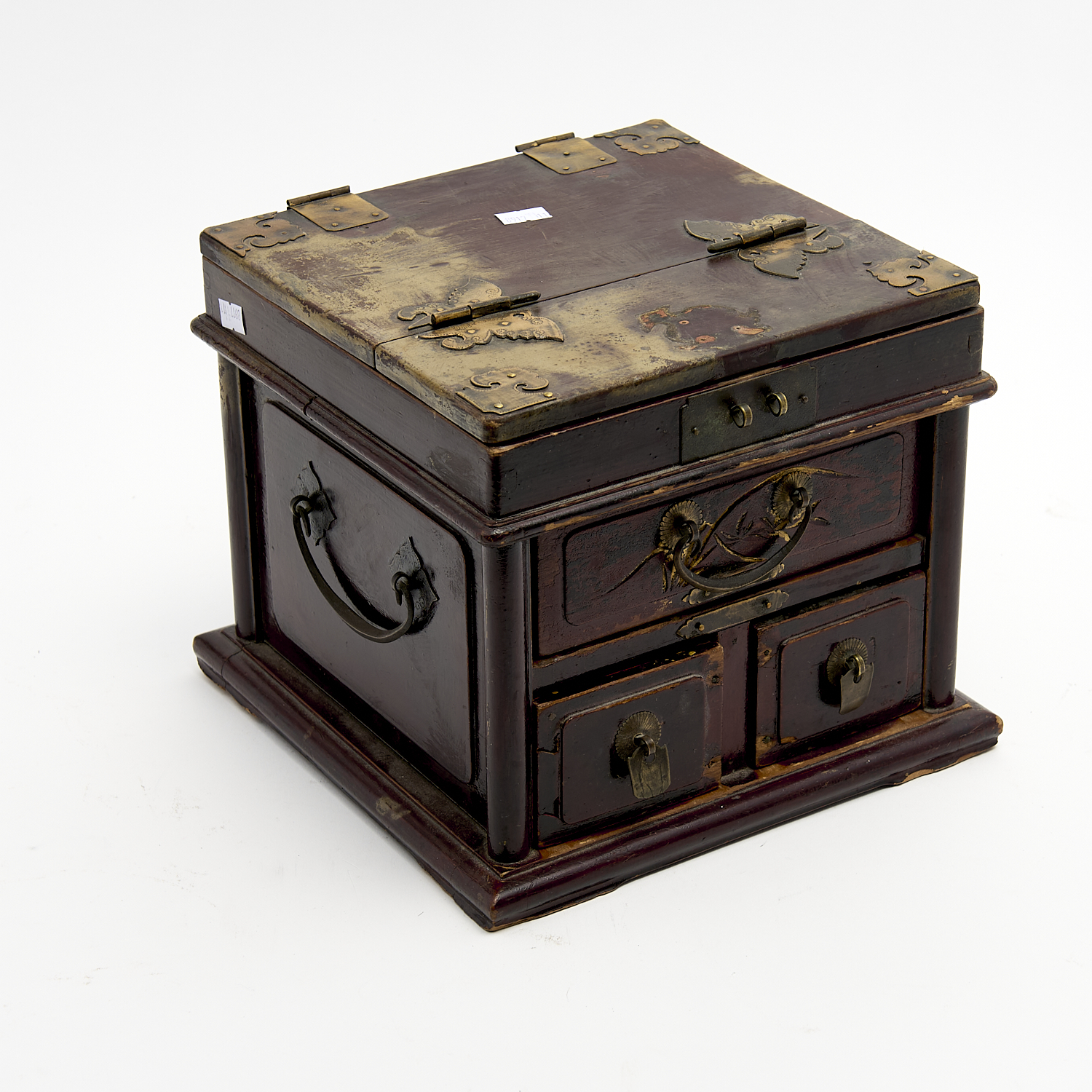 A 19TH CENTURY CHINESE LACQUERED AND GILDED WOODEN THREE DRAWER VANITY CABINET WITH FOLDING MIRROR H.21.5CM, LEONARD JOEL DELIVERY SIZE: MEDIUM
