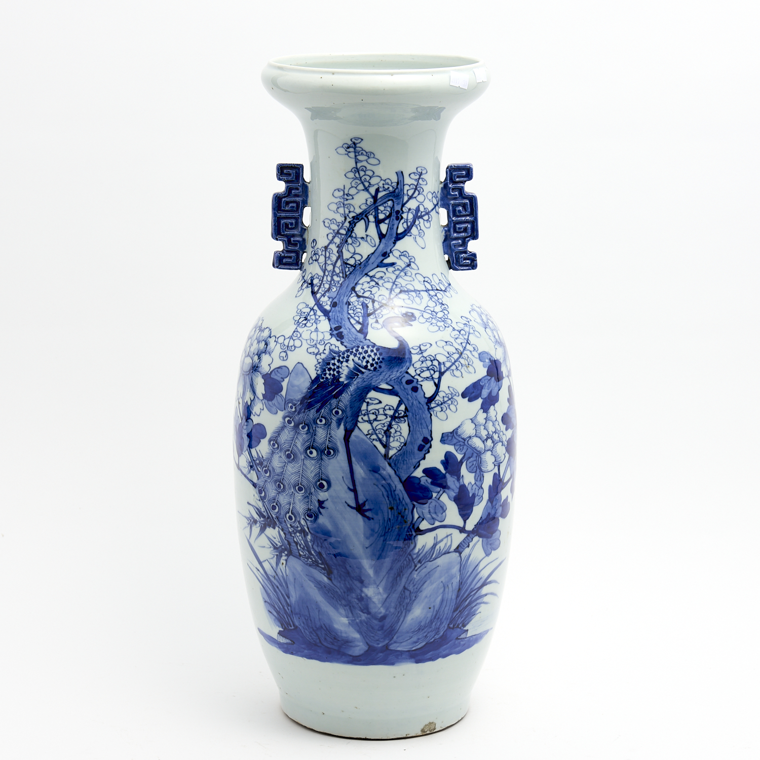 A LARGE CHINESE BLUE AND WHITE PORCELAIN PEACOCK AND TREE DECORATED VASE H.59CM, LEONARD JOEL DELIVERY SIZE: LARGE