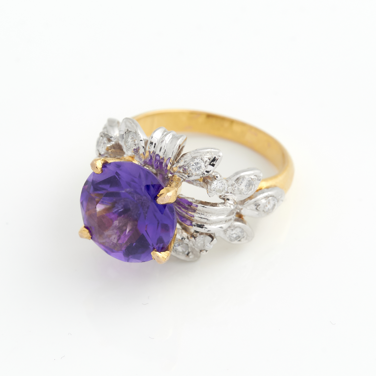 AN AMETHYST AND DIAMOND RING IN 18CT TWO-TONE GOLD, THE AMETHYST WEIGHING 3.24CTS, SIZE K