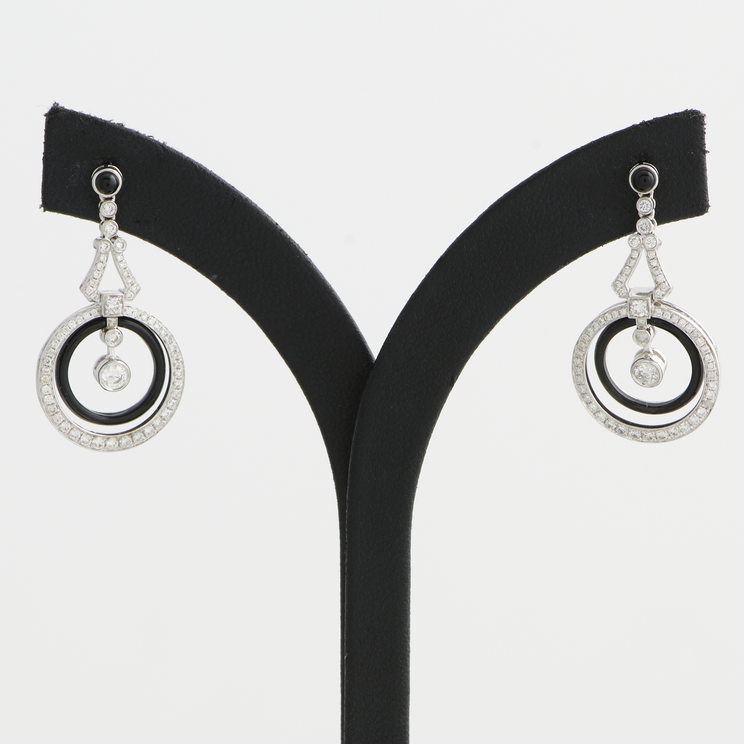 A PAIR OF ONYX AND DIAMOND EARRINGS IN 14CT WHITE GOLD, THE DIAMONDS TOTALLING 1.30CTS, TO POST AND BUTTERFLY FITTINGS, 30MM