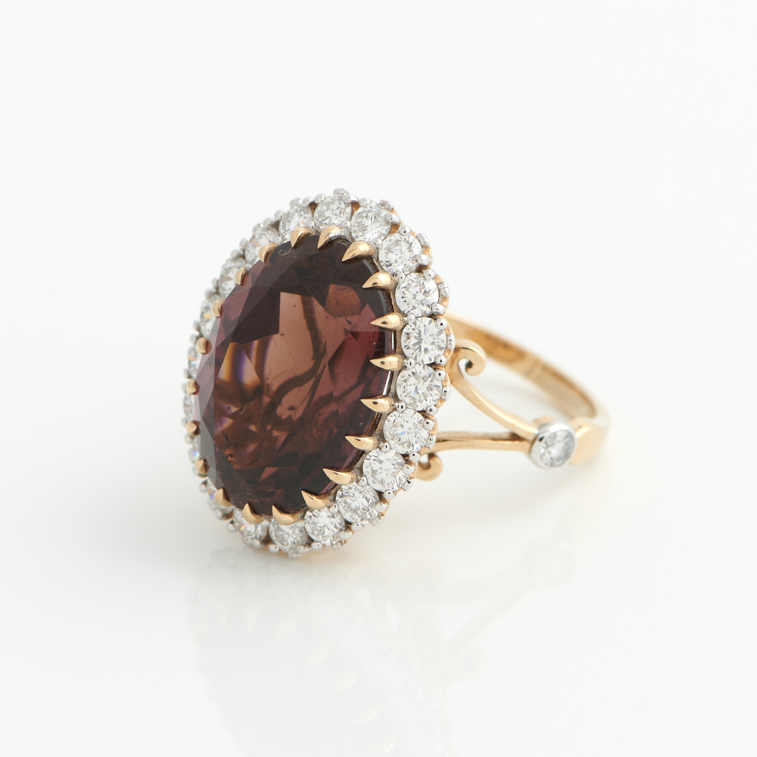 A TOURMALINE AND DIAMOND RING IN 14CT GOLD, THE TOURMALINE WEIGHING 10.92CTS, THE DIAMONDS TOTALLING 1.33CTS, SIZE M, 7.3GMS