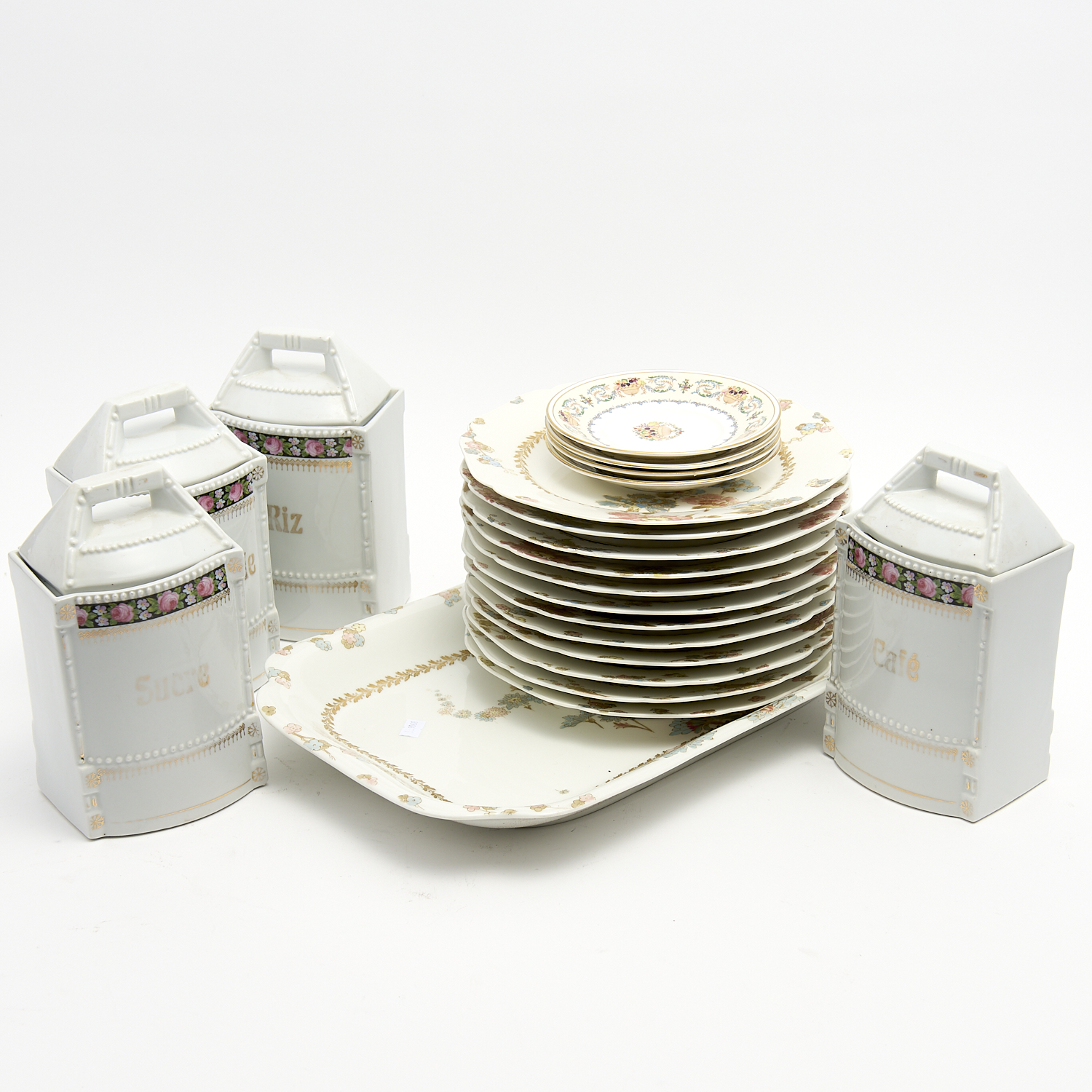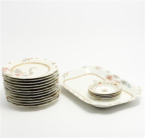 A PART VERMEREN COCHE FLORAL PATTERN SETTING COMPRISING TWELVE PLATES AND A PLATTER TOGETHER WITH FOUR DECORATIVE ANSLEY SAUCERS L.42.5CM (LONGEST)