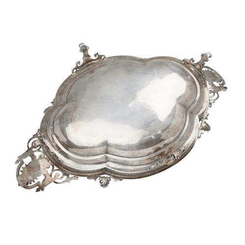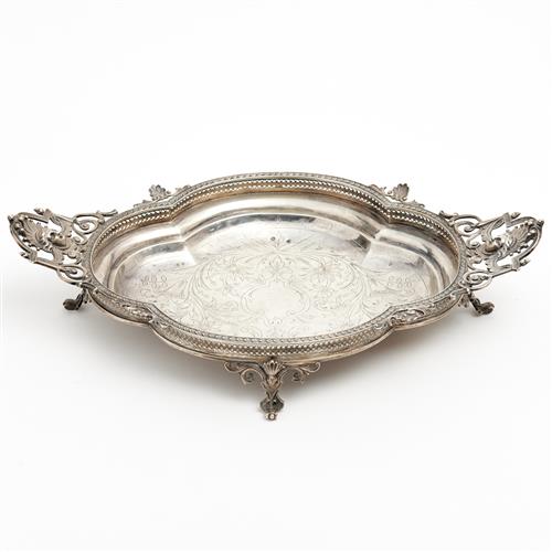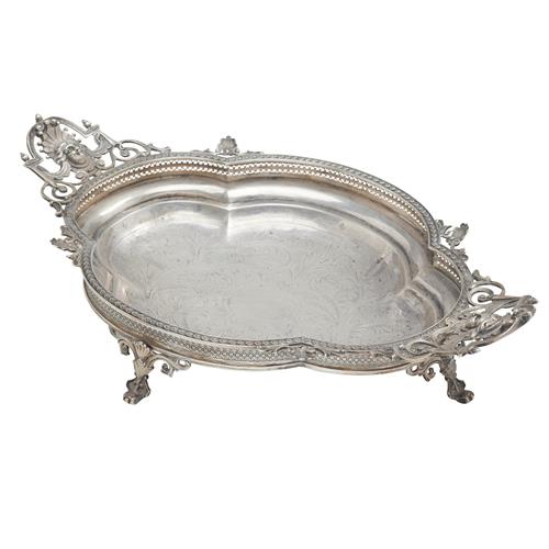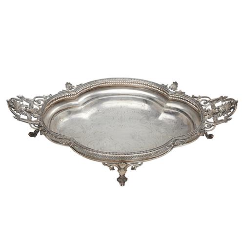 Of elongated quatrefoil outline with moulded sides surmounted with a pierced gallery, a pierced handle of scrolling design centred on a Classical mask to each end, on four foliate feet