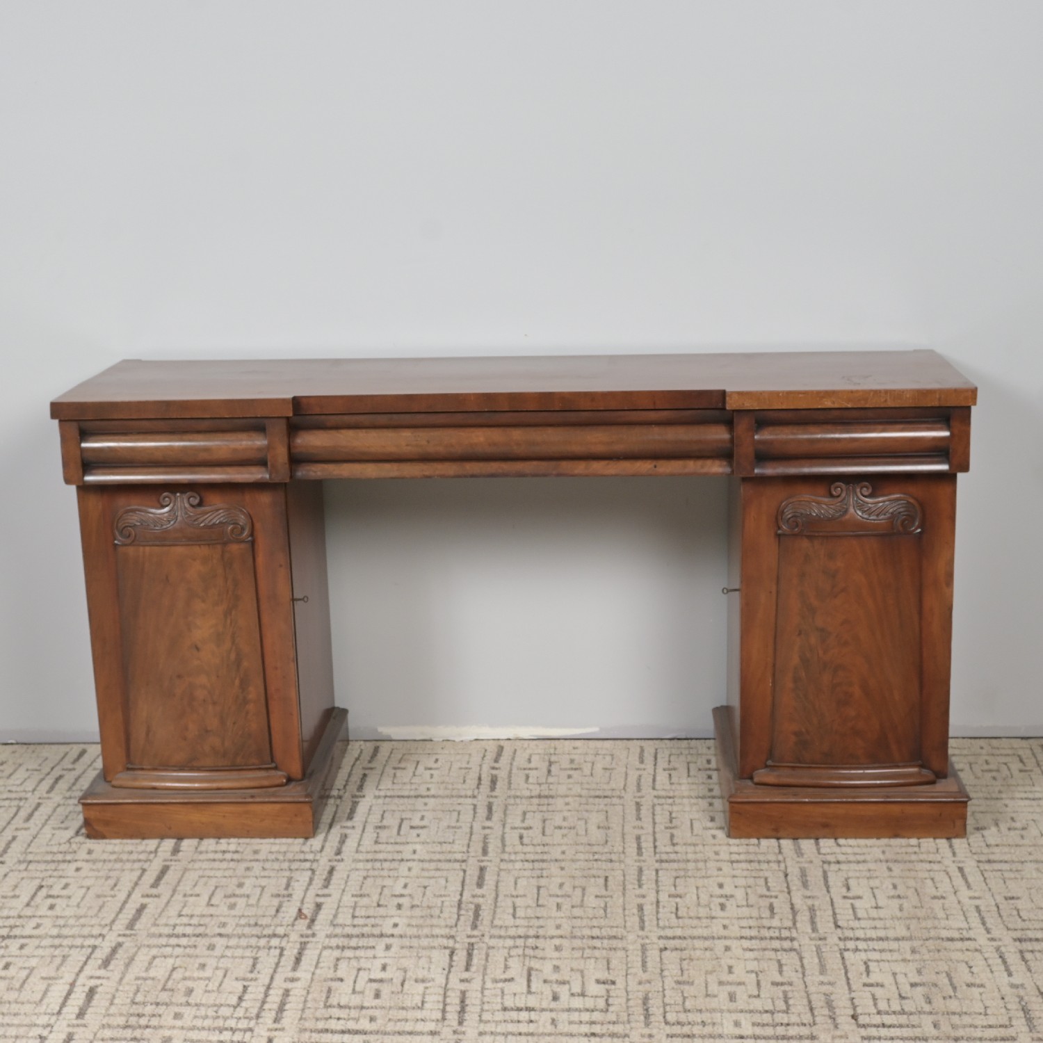 AN EARLY VICTORIAN MAHOGANY PEDESTAL SIDEBOARD (94H X 183W X 58D CM) (THIS HEAVY ITEM MUST BE REMOVED BY CARRIERS AT THE CUSTOMER'S EXPENSE. LEONARD JOEL STAFF CANNOT ASSIST CARRYING THIS ITEM)