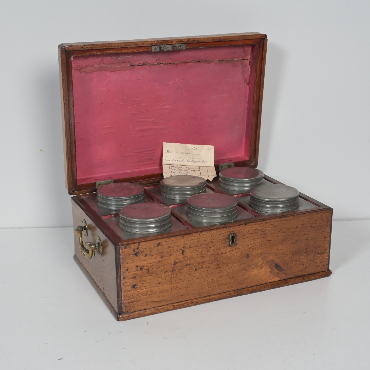 A 19TH CENTURY OAK CASED SIX CANISTER TEA CADDY (17H X 41W X 29D CM) (LEONARD JOEL DELIVERY: MEDIUM)