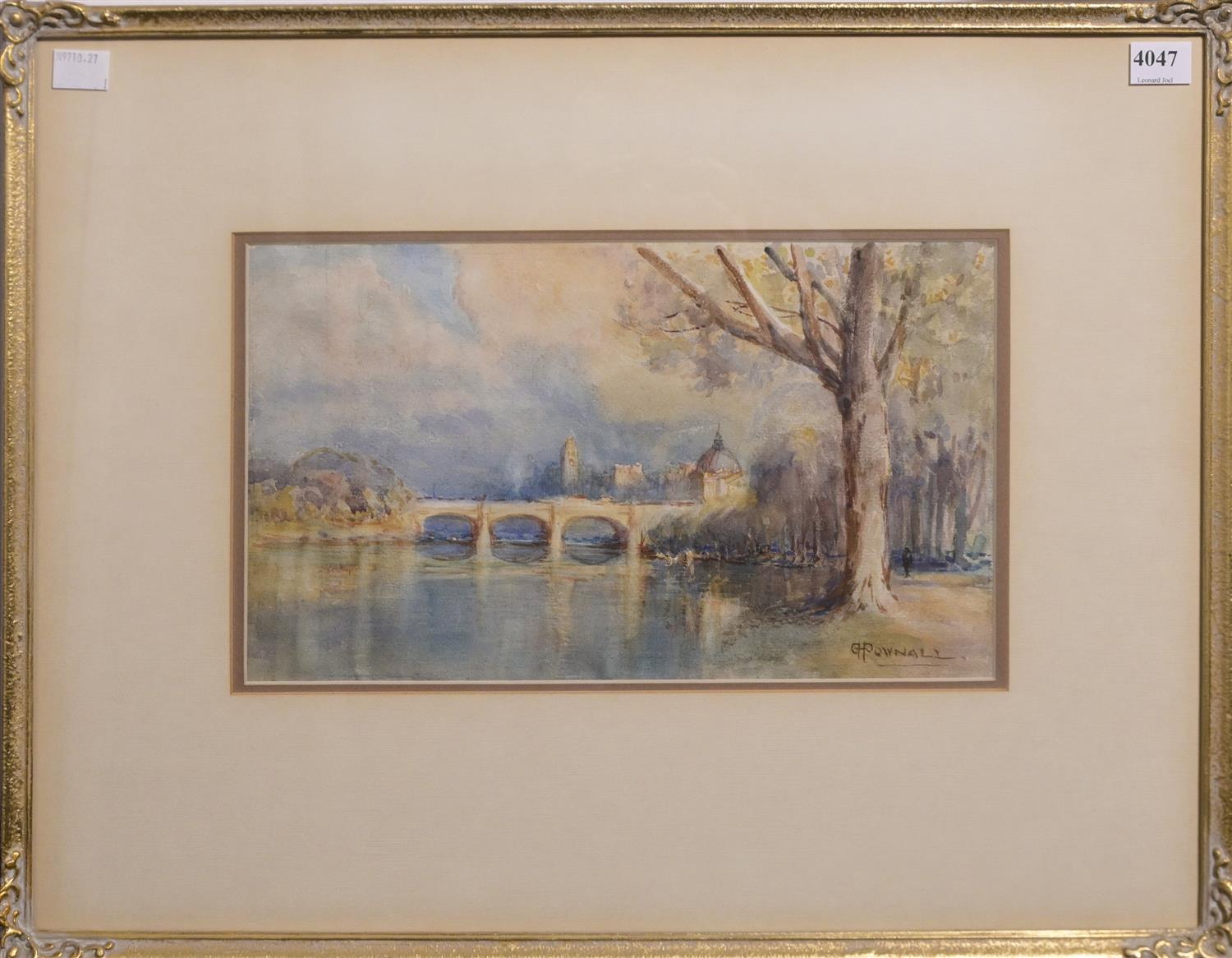 GEORGE HYDE POWNALL, (EMBANKMENT BY BIG BEN), WATERCOLOUR ON PAPER, SIGNED LOWER RIGHT, 17.5 X 30.5CM, FRAME SIZE: 39 X 50.5CM