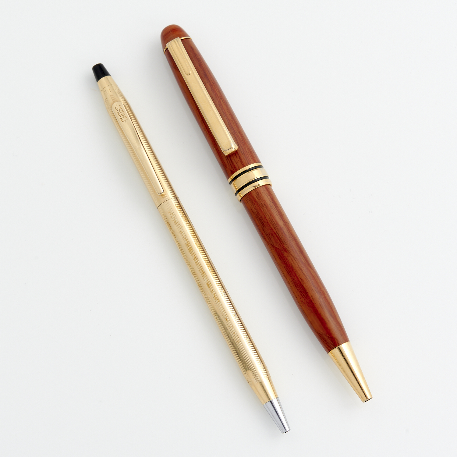 A CROSS PEN STYLED IN GOLD PLATE TOGETHER WITH AN UNSIGNED PEN STYLED IN A TIMBER WITH GOLD PLATED ACCENTS