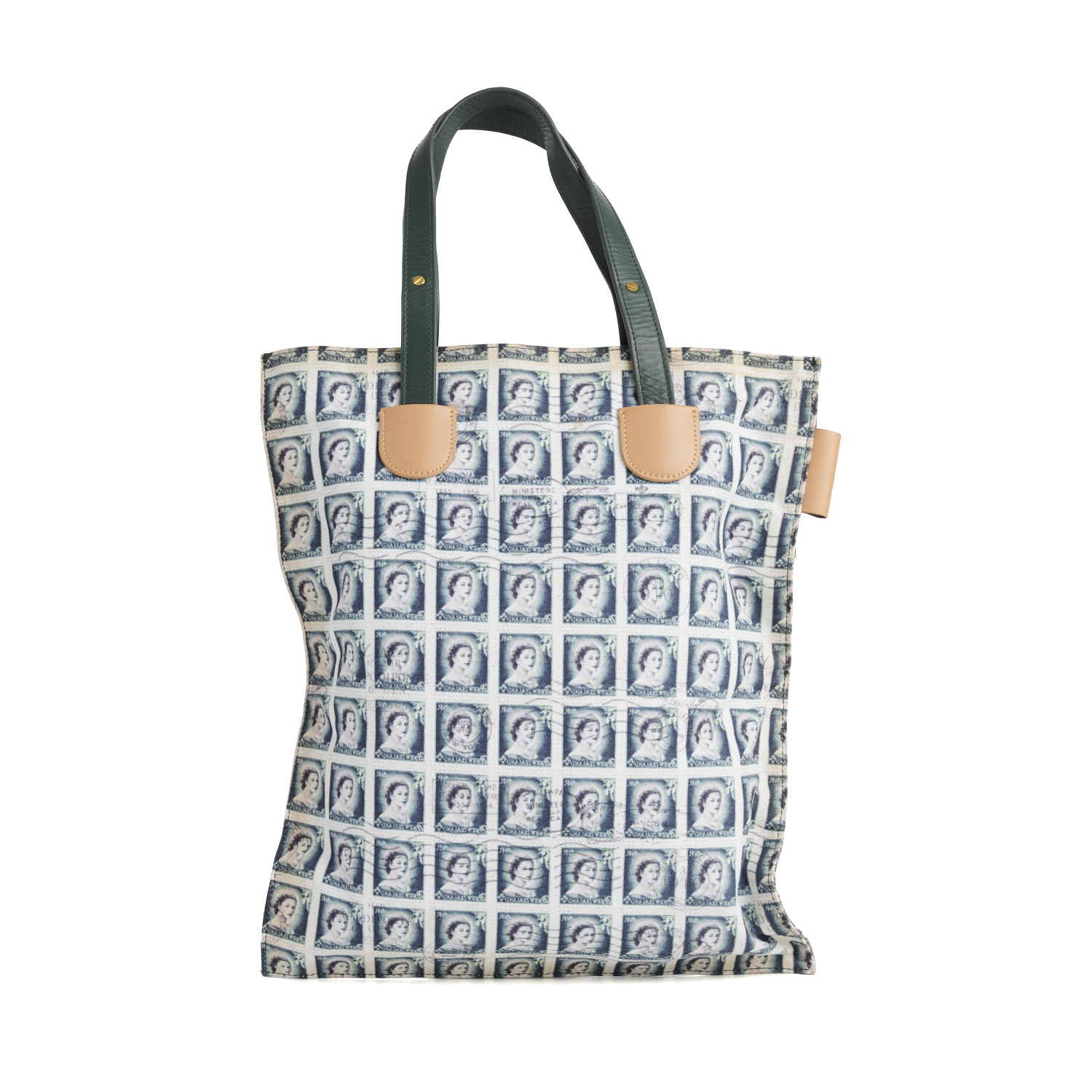CARVEN, A CANVAS TOTE BAG FEATURING QUEEN ELIZABETH STAMP PRINTED DETAIL, WITH GREEN AND TAN LEATHER TRIM, 41 X 35CM