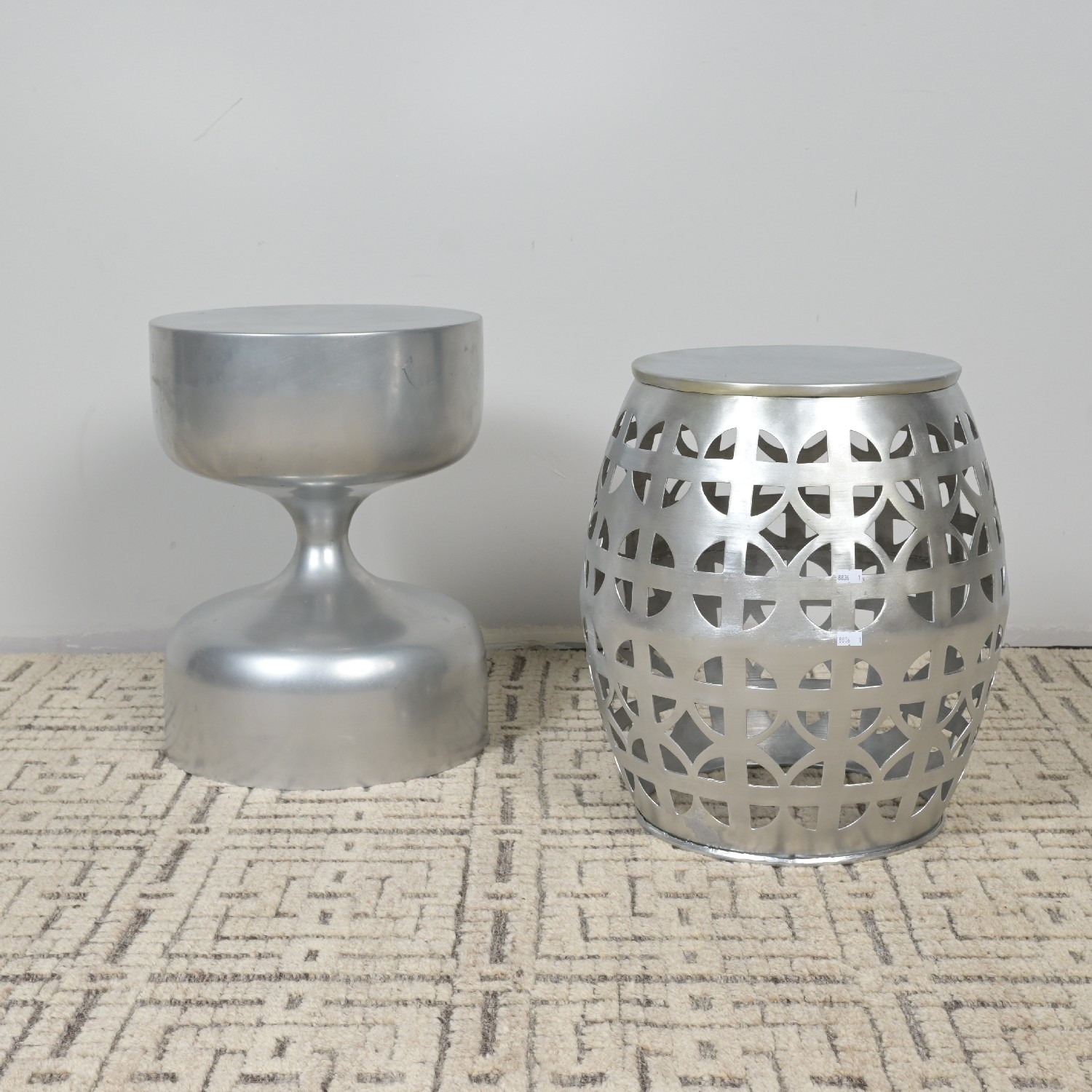 TWO SILVER SIDE TABLES (A/F) (45H X 36DIA CM) (LEONARD JOEL DELIVERY: LARGE)