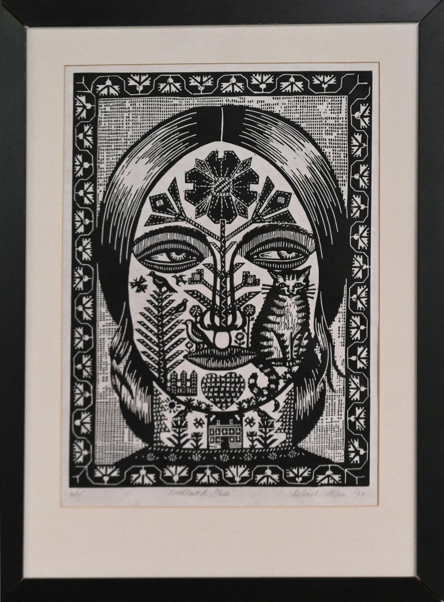 DEBORAH KLEIN, NEEDLEWORK FACE 1997, LINOCUT ED. 4/15, SIGNED TITLED, DATED AND EDITIONED, 44.5 X 31.5CM, FRAME SIZE: 65 X 47CM