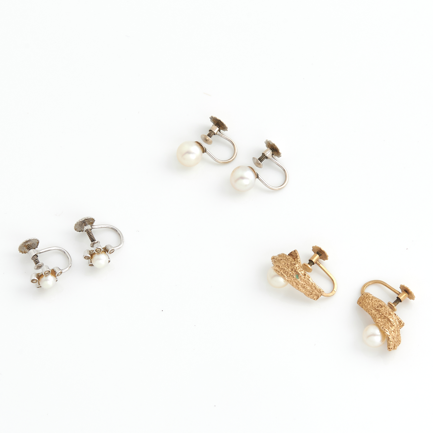 THREE PAIRS PEARL OF EARRINGS IN 9CT GOLD AND WHITE GOLD, ALL WITH SCREW BACK FITTINGS, 8.5GMS