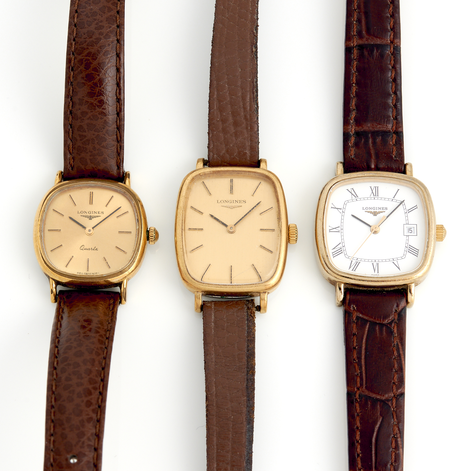 LONGINES, QUARTZ MOVEMENT, TO STAINLESS STEEL CASES VINTAGE AND LEATHER BANDS, THE CASE MEASURING APPROXIMATELY 19MM 20MM AND 22MM