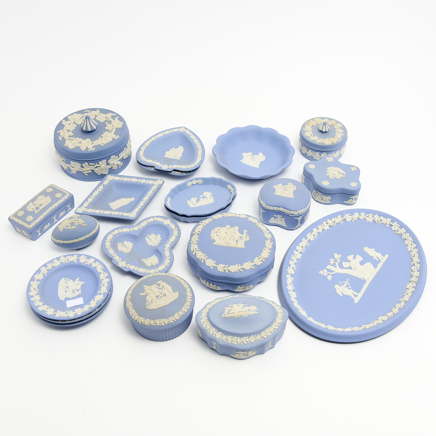 A COLLECTION OF WEDGWOOD JASPERWARE INCLUDING VARIOUS BOXES, TRAYS, AND DISHES L.24.5CM (LONGEST), LEONARD JOEL DELIVERY SIZE: LARGE