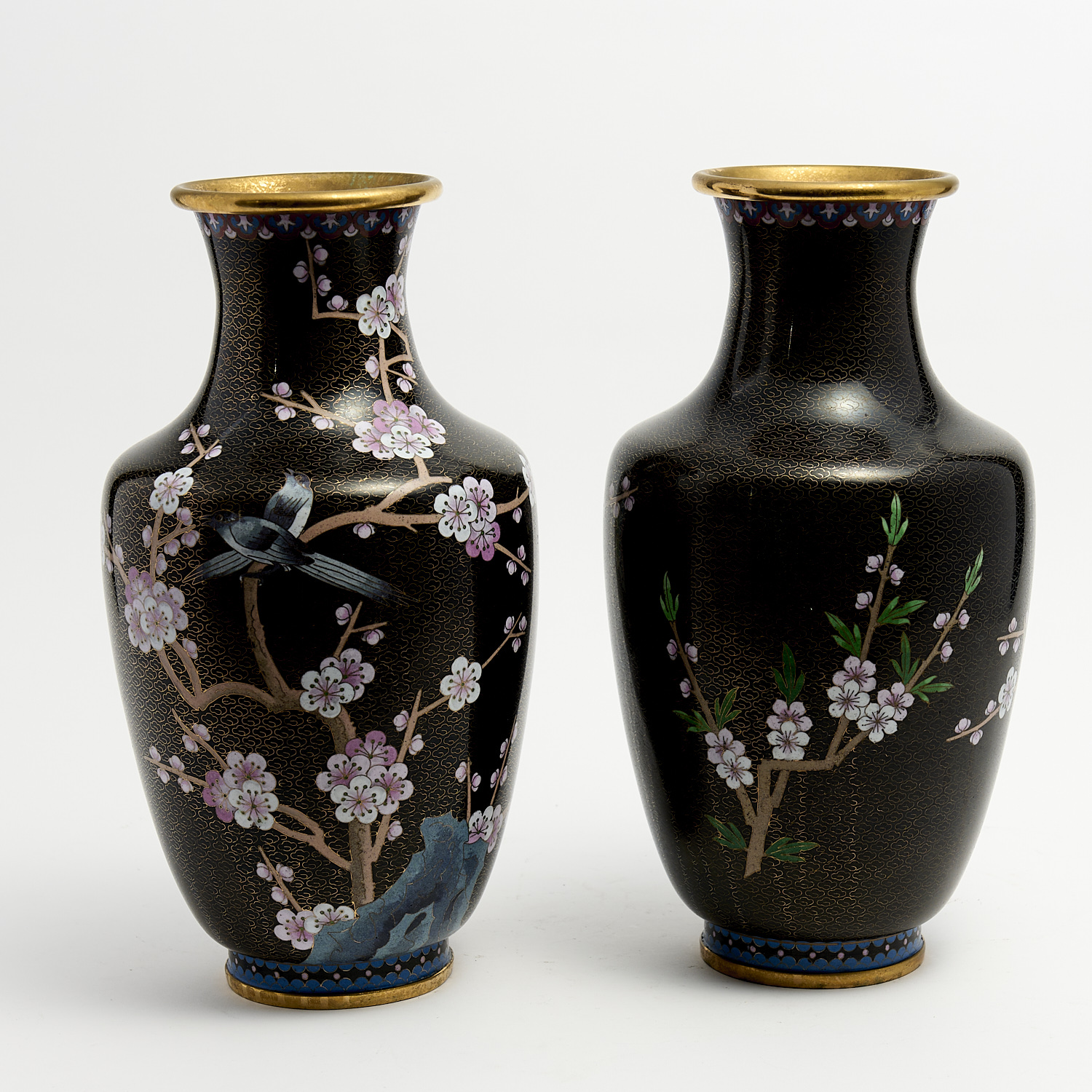 A PAIR OF CHINESE CLOISONNE VASES WITH BIRDS ON FOLIAGE H.39.5CM, LEONARD JOEL DELIVERY SIZE: LARGE