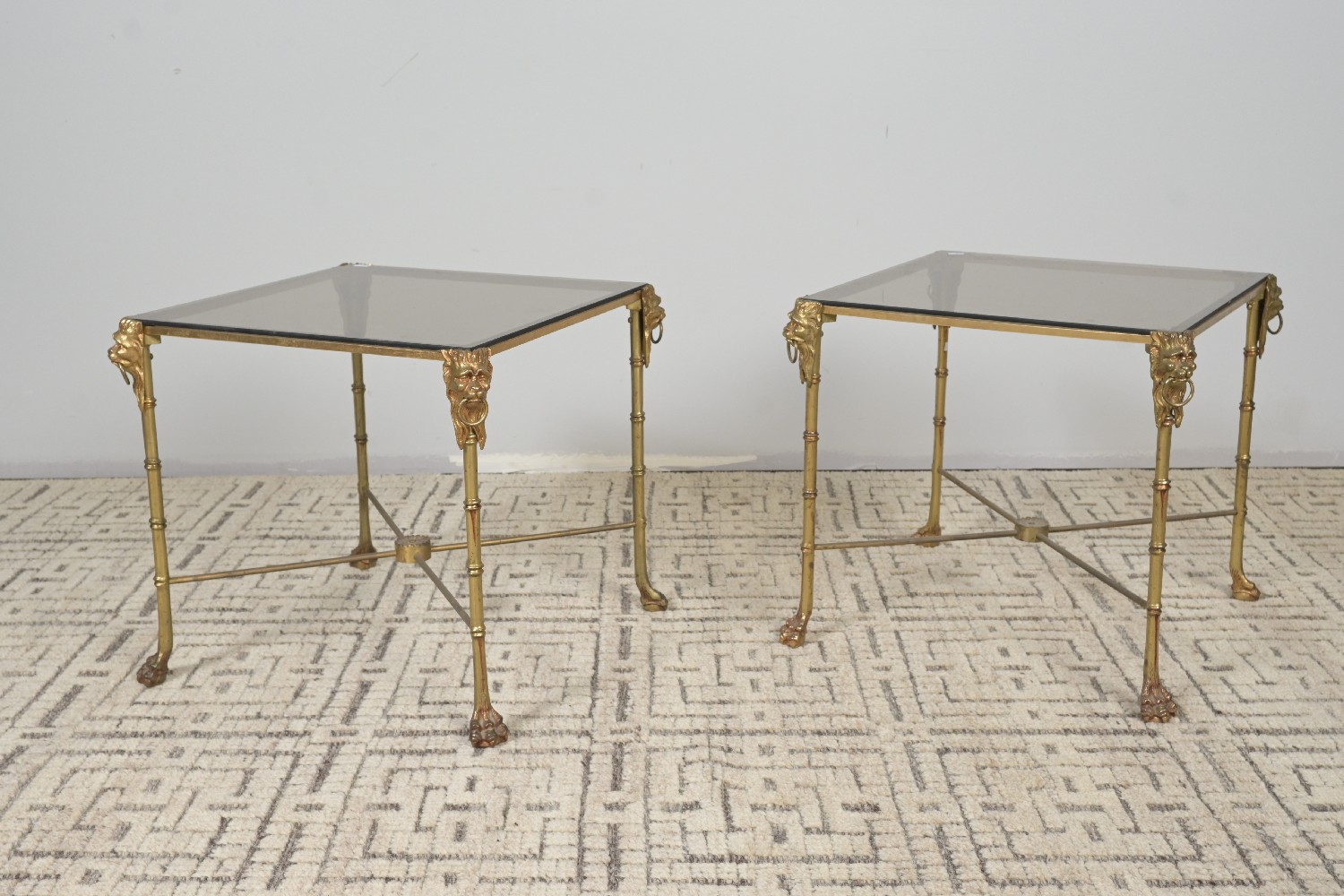 A PAIR OF BRASS & SMOKED GLASS SIDE TABLES WITH LIONS HEAD MOTIF IN CLASSICAL MANNER (39H X 49W X 49D CM) (LEONARD JOEL DELIVERY: LARGE)