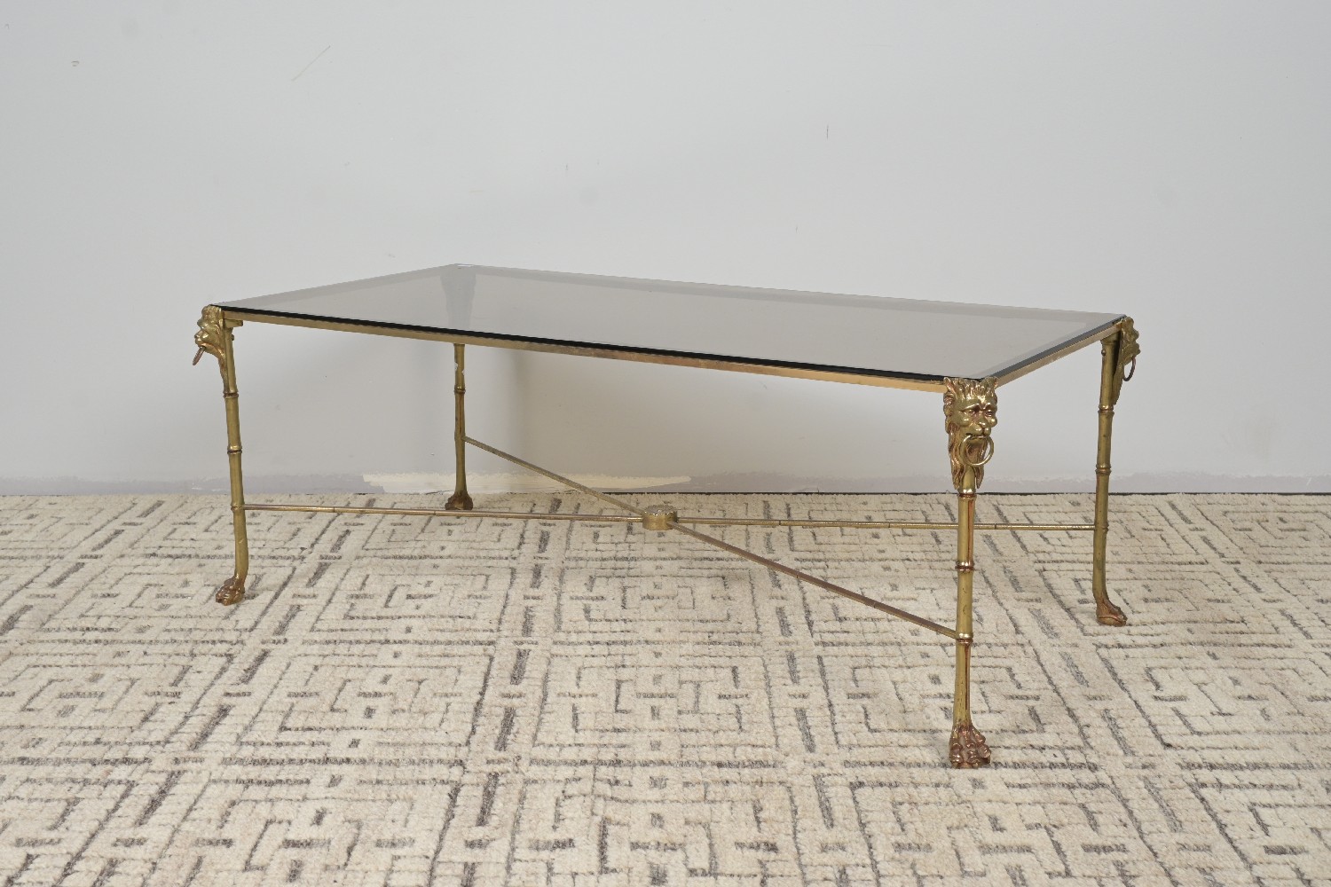A BRASS & SMOKED GLASS COFFEE TABLE WITH LIONS HEAD MOTIF IN CLASSICAL MANNER (39H X 103W X 53D CM) (LEONARD JOEL DELIVERY: X-LARGE)