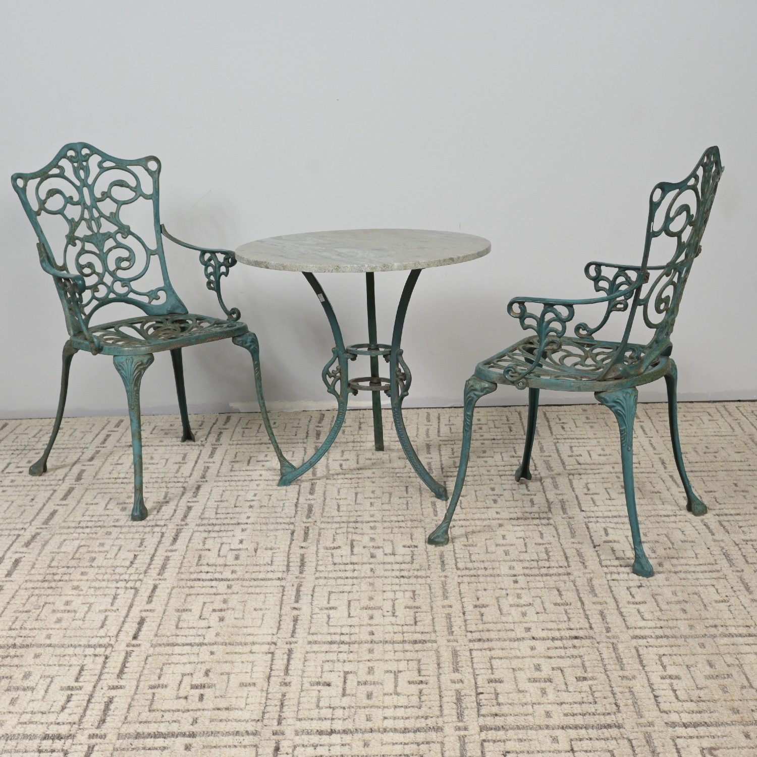 A VICTORIAN CAST IRON THREE PIECE OUTDOOR SETTING (63H X 65DIA CM) (THIS HEAVY ITEM MUST BE REMOVED BY CARRIERS AT THE CUSTOMER'S EXPENSE. LEONARD JOEL STAFF CANNOT ASSIST CARRYING THIS ITEM)