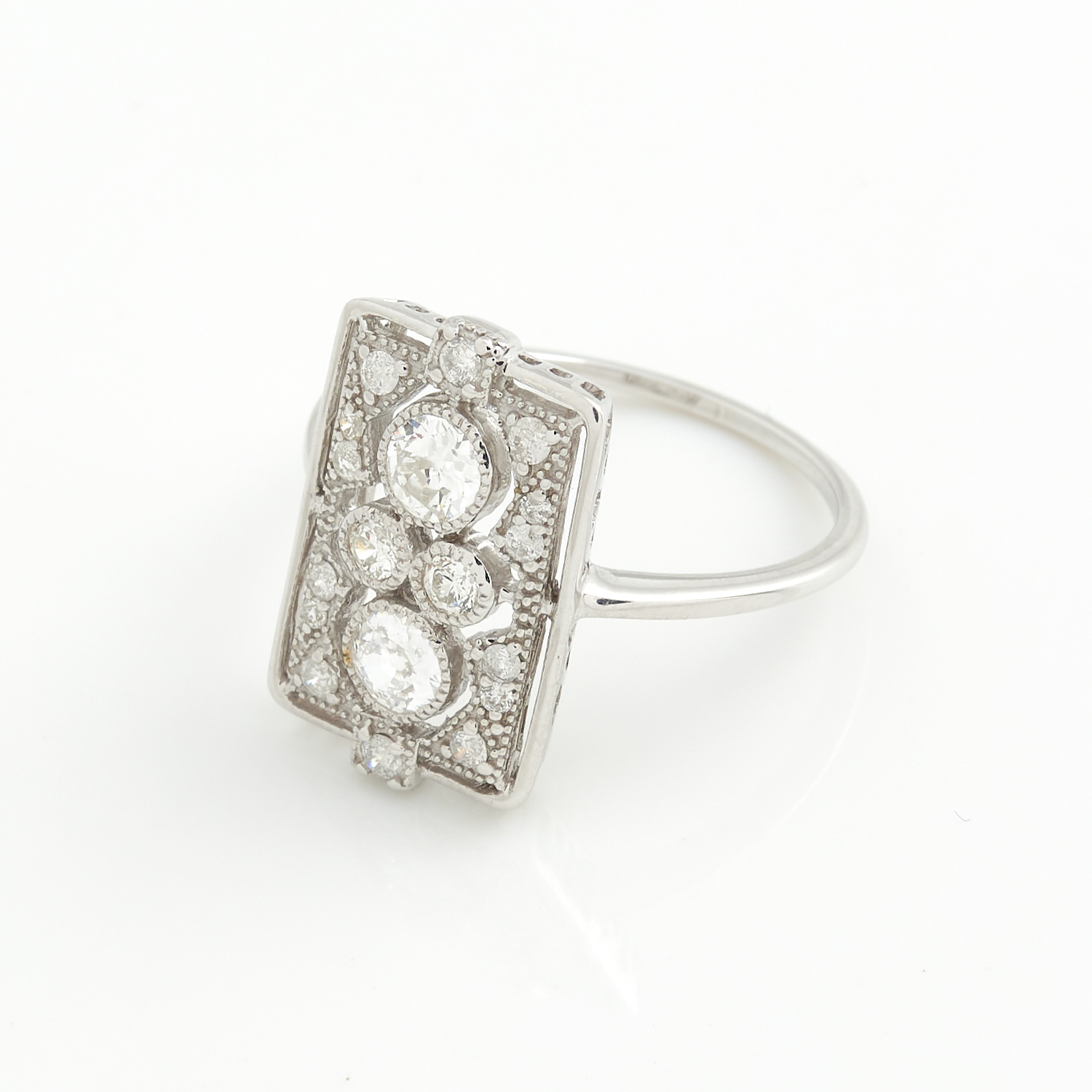 AN ART DECO STYLE DIAMOND RING IN 14CT WHITE GOLD, THE DIAMONDS TOTALLING APPOXIMATELY 1.08CTS, SIZE M, 2.52GMS, ACCOMPANIED BY A VALUATION