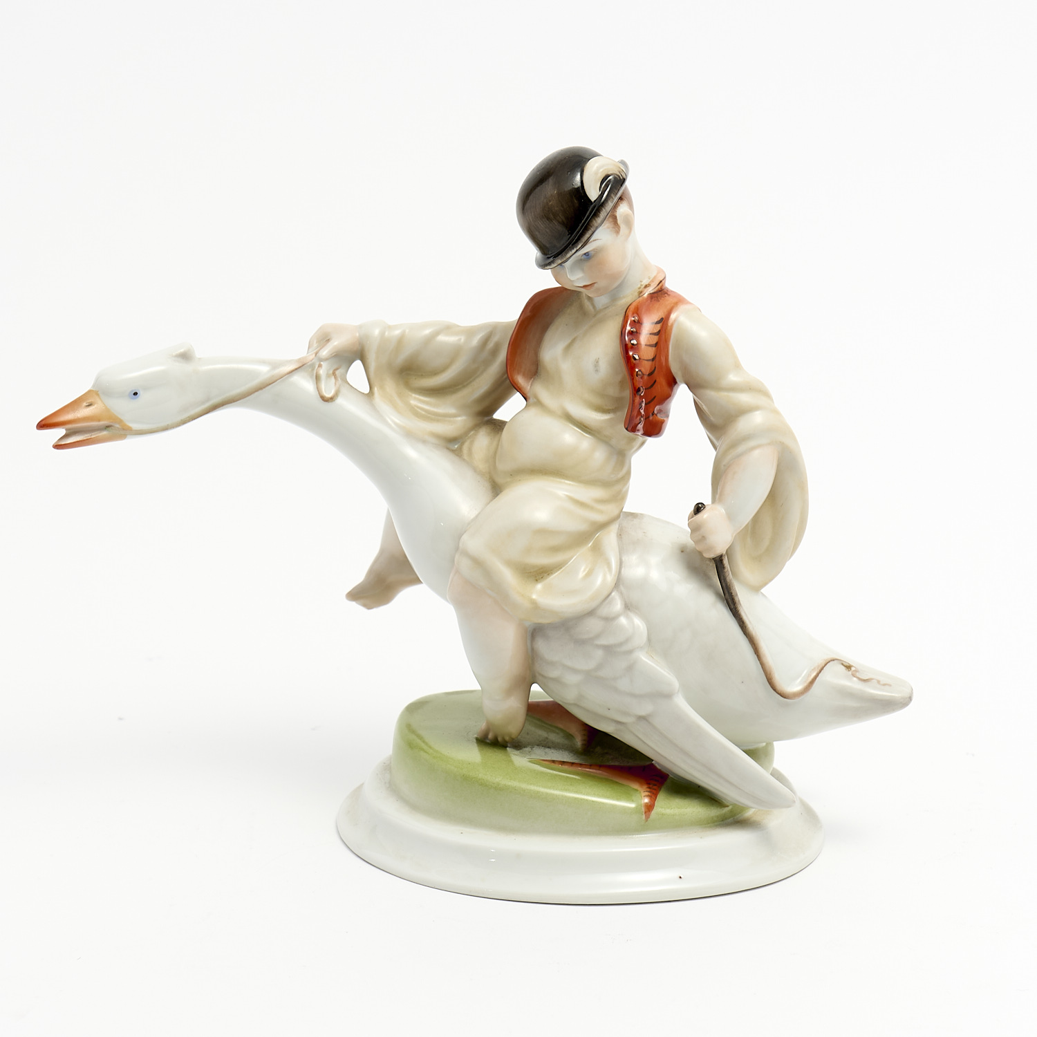 A HEREND PORCELAIN BOY RIDING A GOOSE FIGURE H.21CM, LEONARD JOEL DELIVERY SIZE: SMALL
