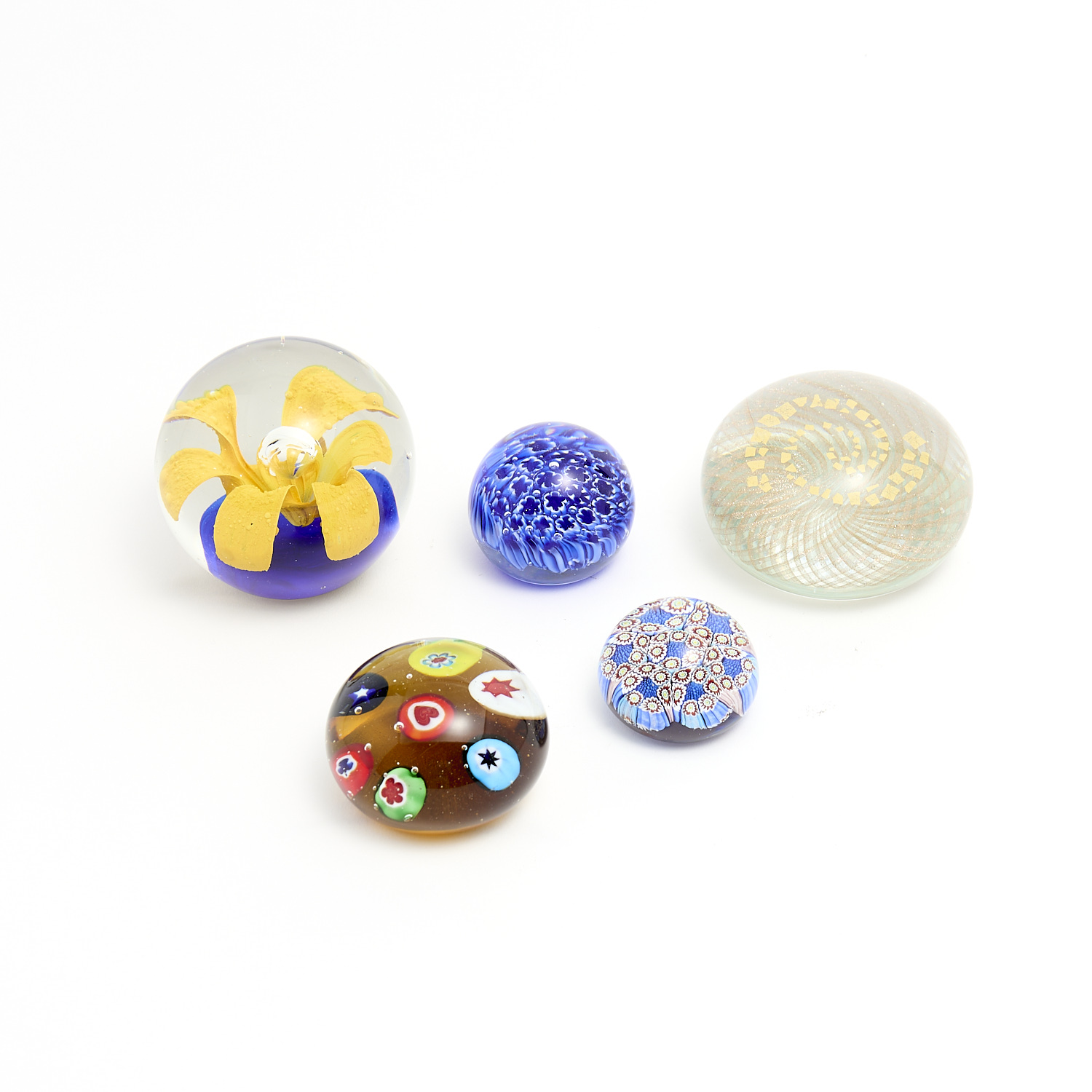A COLLECTION OF FIVE PAPER WEIGHTS INCLUDING BISAZZA VETRO AND MURANO DIA.9CM (LARGEST), LEONARD JOEL DELIVERY SIZE: MEDIUM