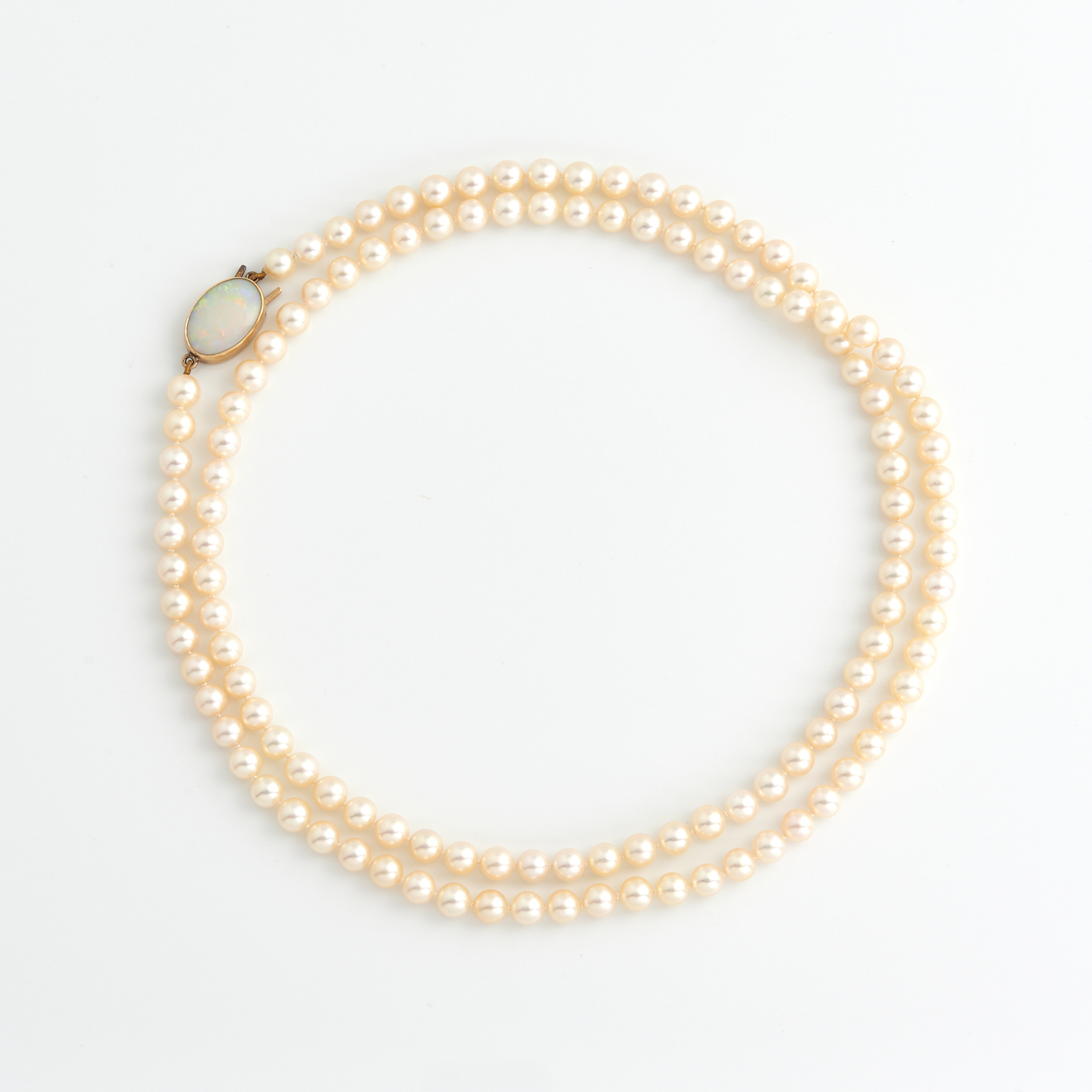 A LONG STRAND OF PEARLS TO AN OPAL SET CLASP IN 9CT GOLD, THE PEARLS MEASURING APPROXIMATELY 6.7MM, 920MM