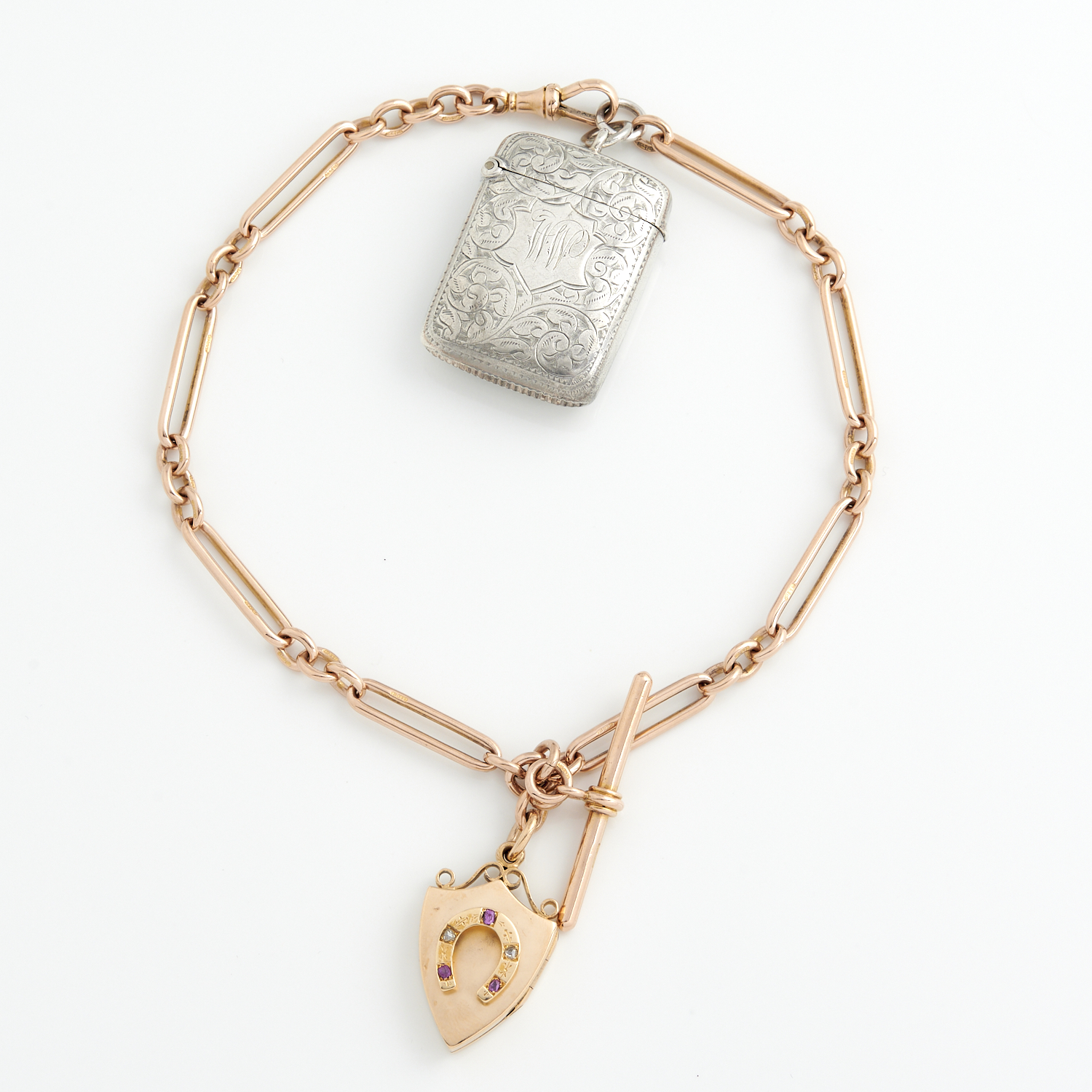 AN ANCHOR LINK CHAIN IN 15CT GOLD, TO A DIAMOND AND RUBY SHIELD PENDANT, TOGETHER WITH A SILVER VESTA CASE, ACCOMPANIED BY A VALUATION