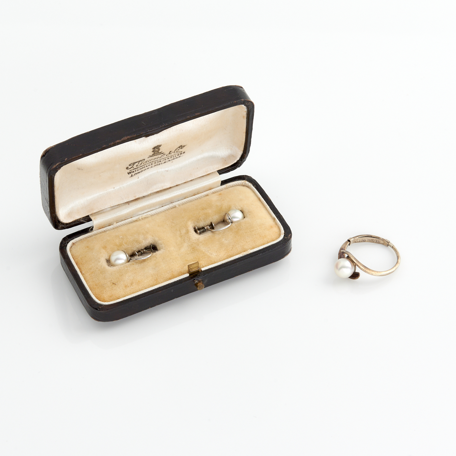 A PAIR OF PEARL EARRINGS IN 9CT WHITE GOLD, ACCOMPANIED WITH BOX AND PEARL RING, SIZE P