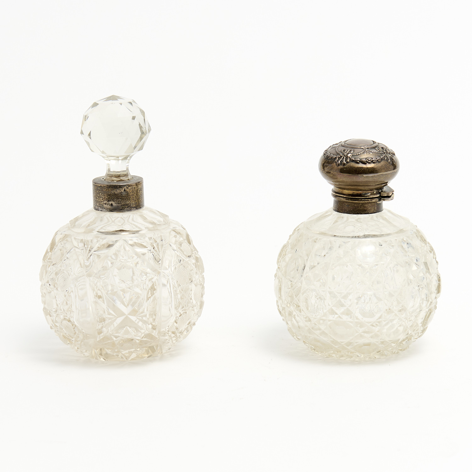 TWO GLASS PERFUME BOTTLES WITH STERLING SILVER LIDS H.13.5CM (TALLEST), LEONARD JOEL DELIVERY SIZE: SMALL