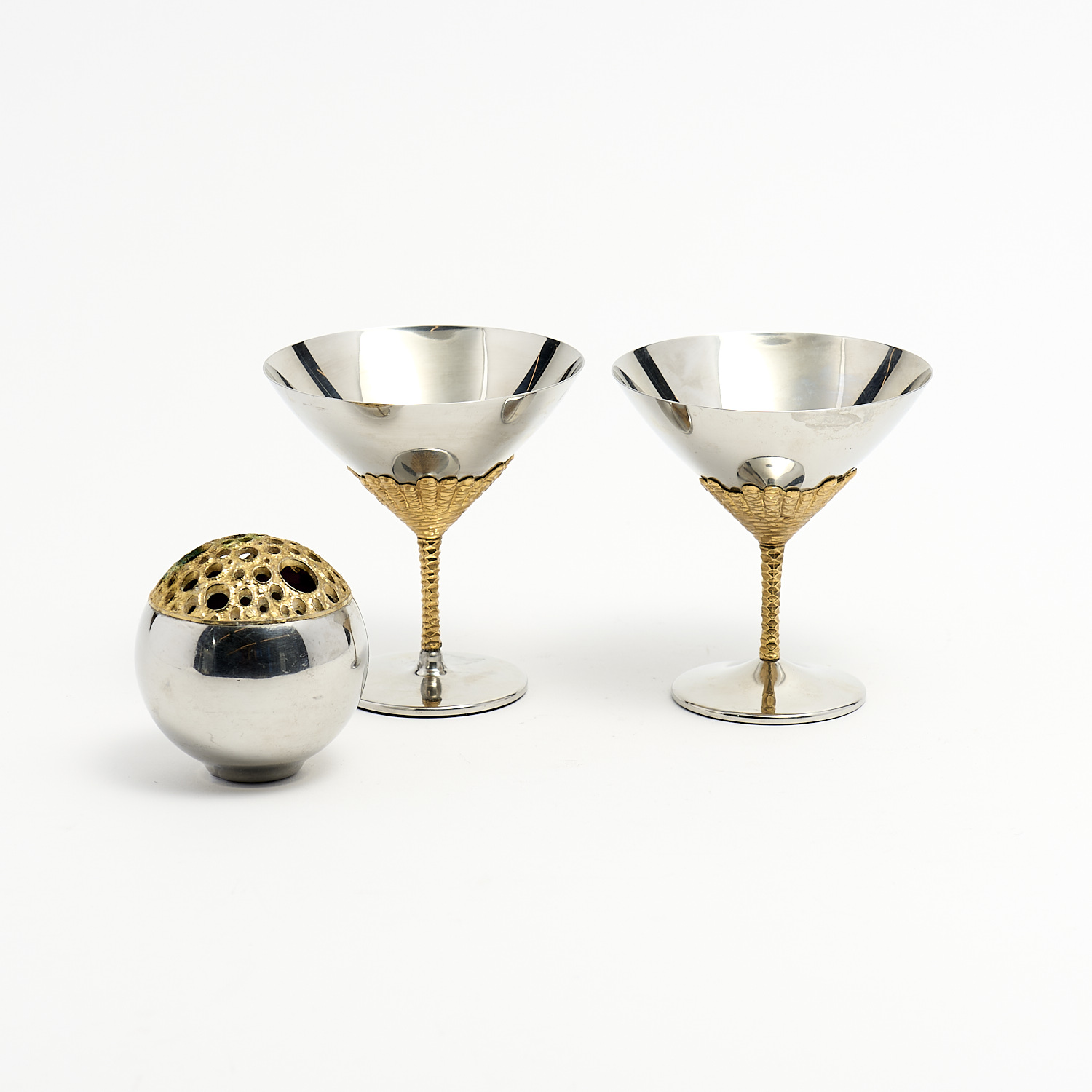A PAIR OF GILT MARTINI GOBLETS AND A BUD VASE BY STUART DEVLIN H.11CM (TALLEST), LEONARD JOEL DELIVERY SIZE: SMALL