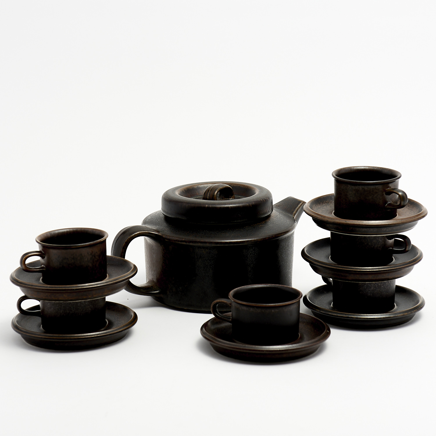 AN ARABIA RUSKA TEA SET WITH TEAPOT AND SIX CUPS AND SIX SAUCERS, MADE IN FINLAND AND DESIGNED BY ULLA PROCOPÉ H.12CM (TEAPOT), LEONARD JOEL DELIVERY SIZE: MEDIUM