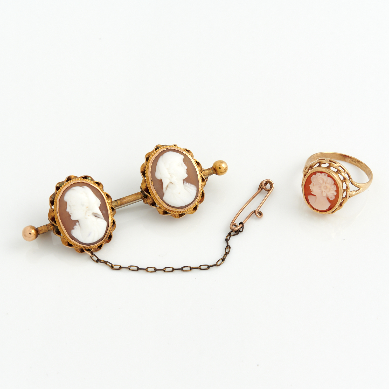 A CAMEO BROOCH AND RING IN 9CT GOLD, SIZE M, 8.3GMS