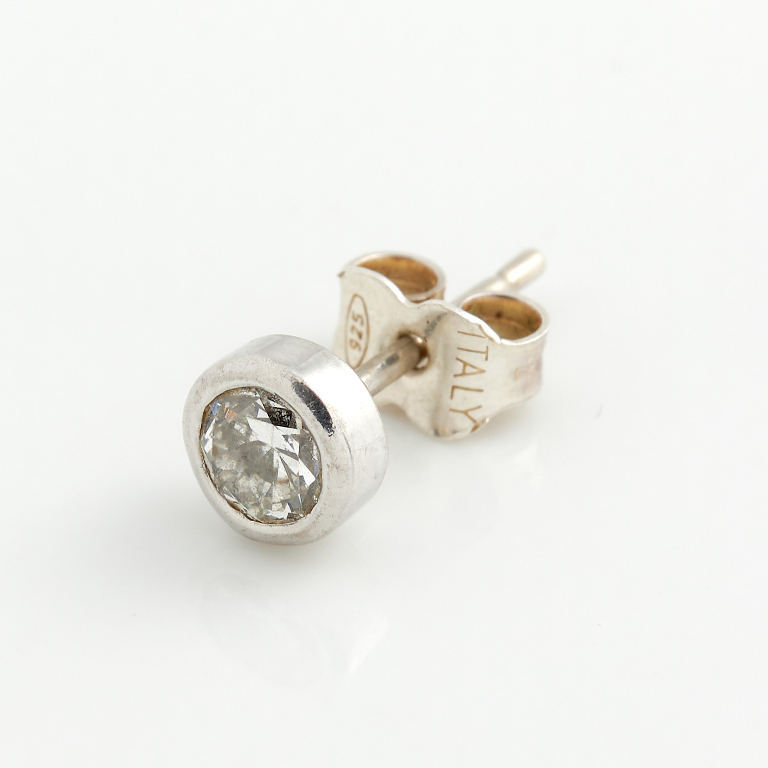 A SINGLE DIAMOND EARRING IN STERLING SILVER, THE DIAMOND WEIGHING APPROXIMATELY 0.20CTS