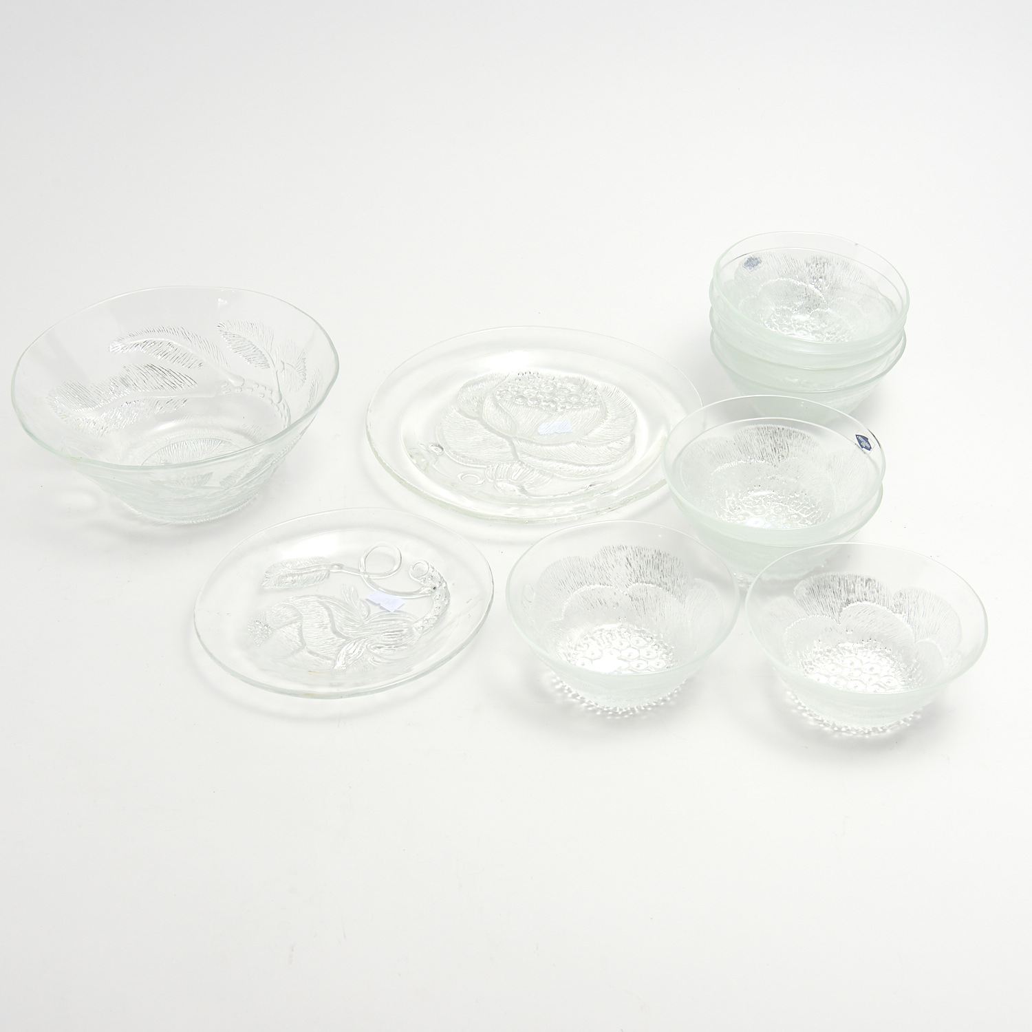 A SET OF NUUTAJÄRVI 'PEONIE' BOWLS AND PLATES BY OIVA TOIKKA, MADE IN FINLAND (11 PIECES TOTAL) DIA.20CM (LARGEST BOWL)