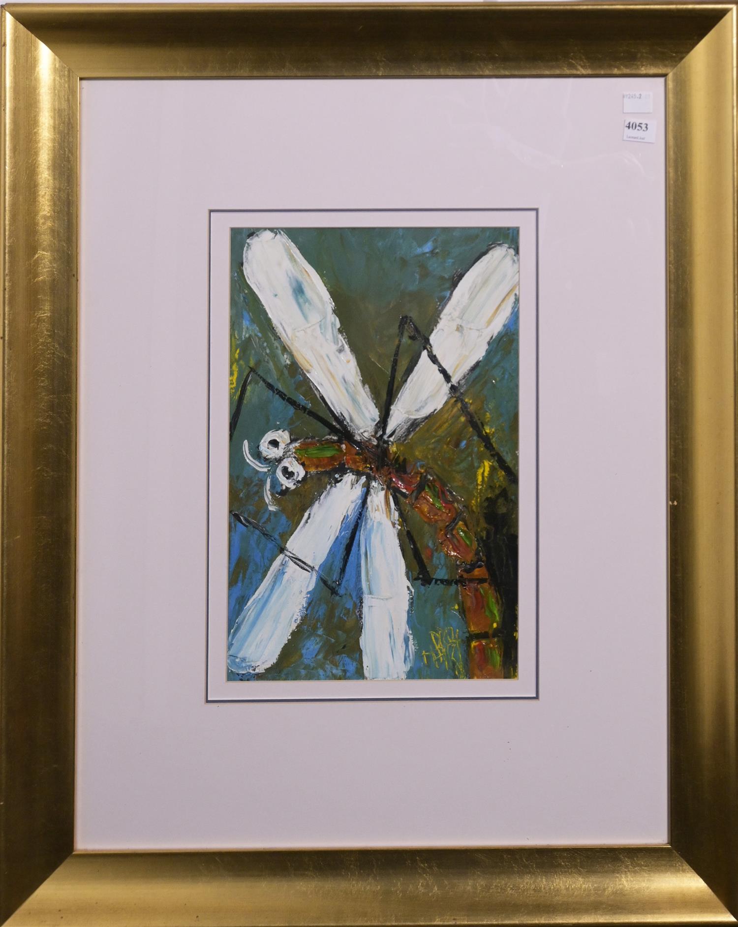 PRO HART, DRAGONFLY, OIL ON BOARD, SIGNED LOWER RIGHT, 34.5 X 22.5CM, FRAME SIZE: 71.5 X 57.5CM