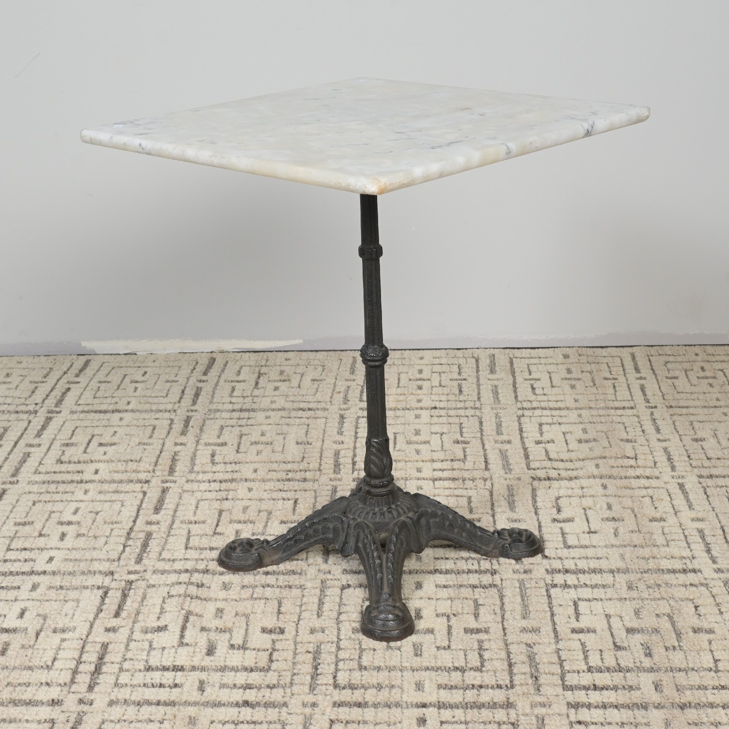 A MARBLE TOPPED SQUARE FORM CAFE TABLE ON CAST IRON BASE (A/F) (73H X 60W X 60D CM) (LEONARD JOEL DELIVERY: X-LARGE)
