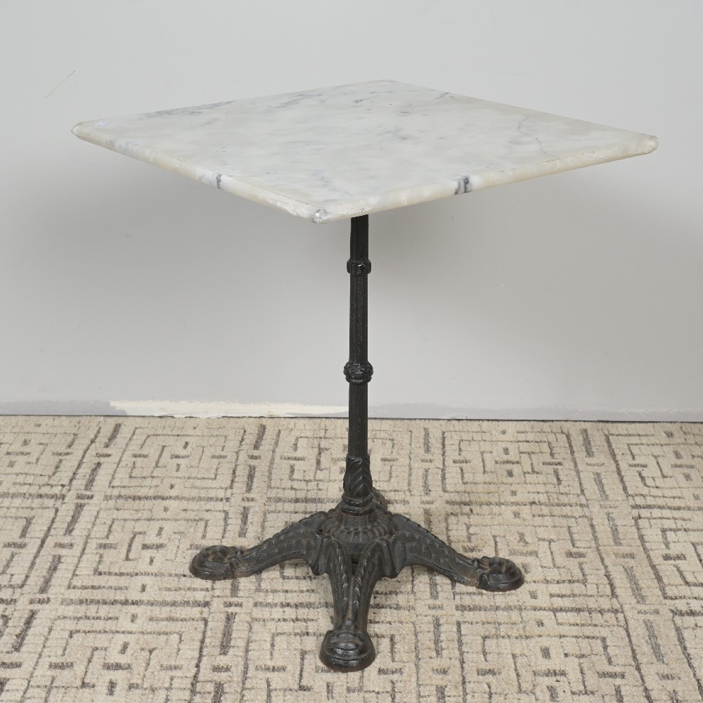 A MARBLE TOPPED SQUARE FORM CAFE TABLE ON CAST IRON BASE (A/F) (73H X 60W X 60D CM) (LEONARD JOEL DELIVERY: X-LARGE)