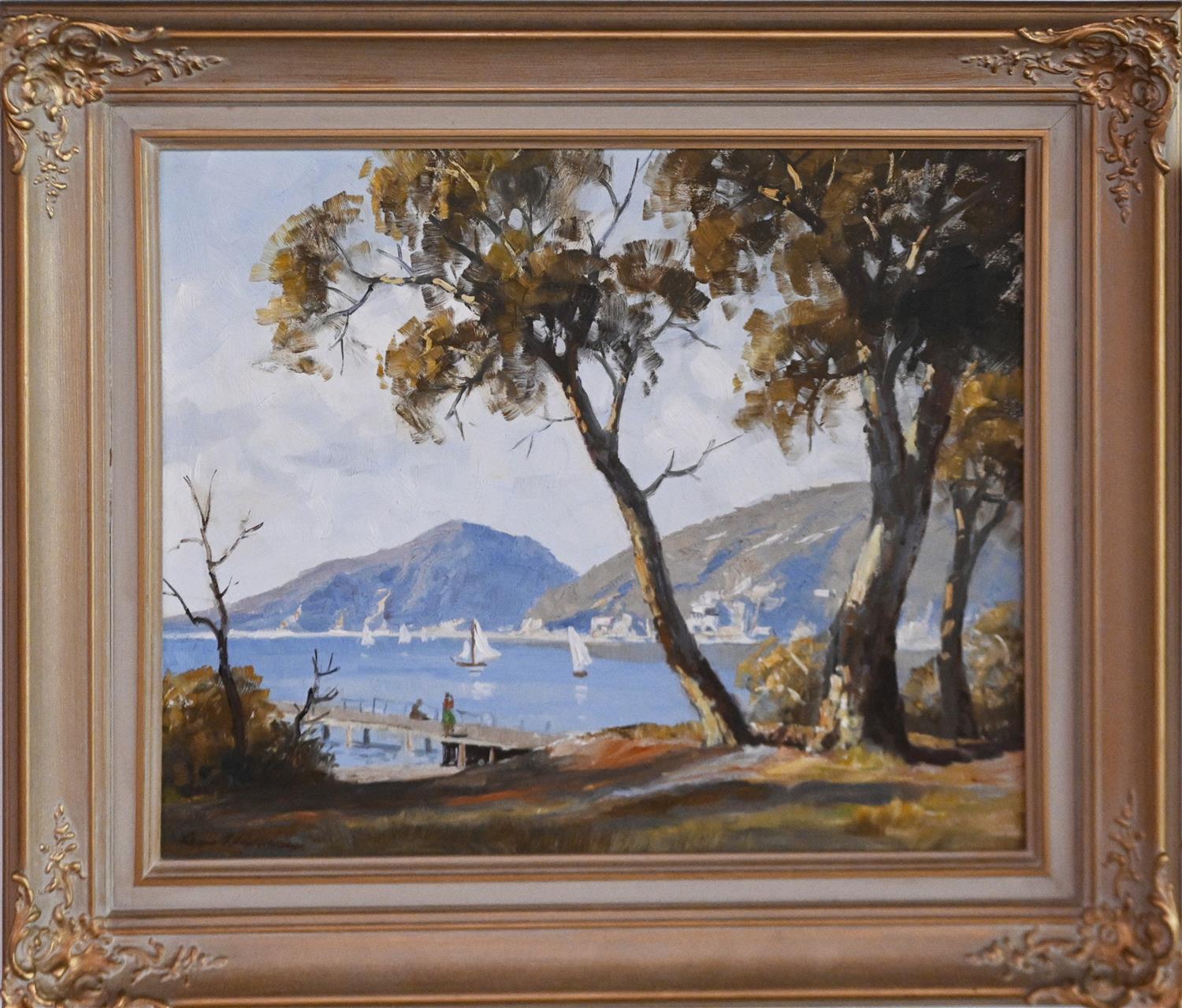 LEON HANSON, BLUE WATERS OF SHOAL BAY N.S.W., OIL ON MASONITE, SIGNED LOWER LEFT, TITLED VERSO, 37 X 44CM, FRAME SIZE: 52.5 X 60CM