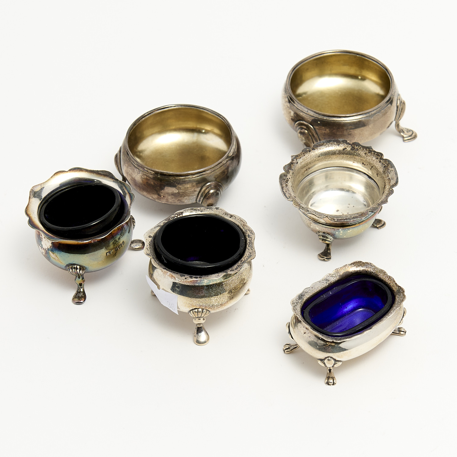 A COLLECTION OF SIX STERLING SILVER SALT CELLARS, THREE WITH BLUE LINERS 210G (EXCLUDING LINERS) H.4.5CM (TALLEST), LEONARD JOEL DELIVERY SIZE: SMALL